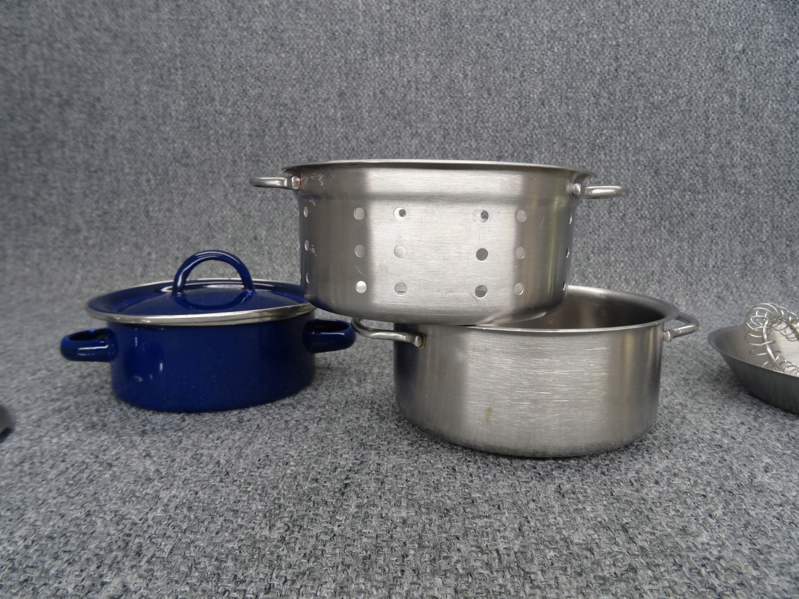 Набір мініатюрних металевих каструль, сковороди, качалки, тарілок