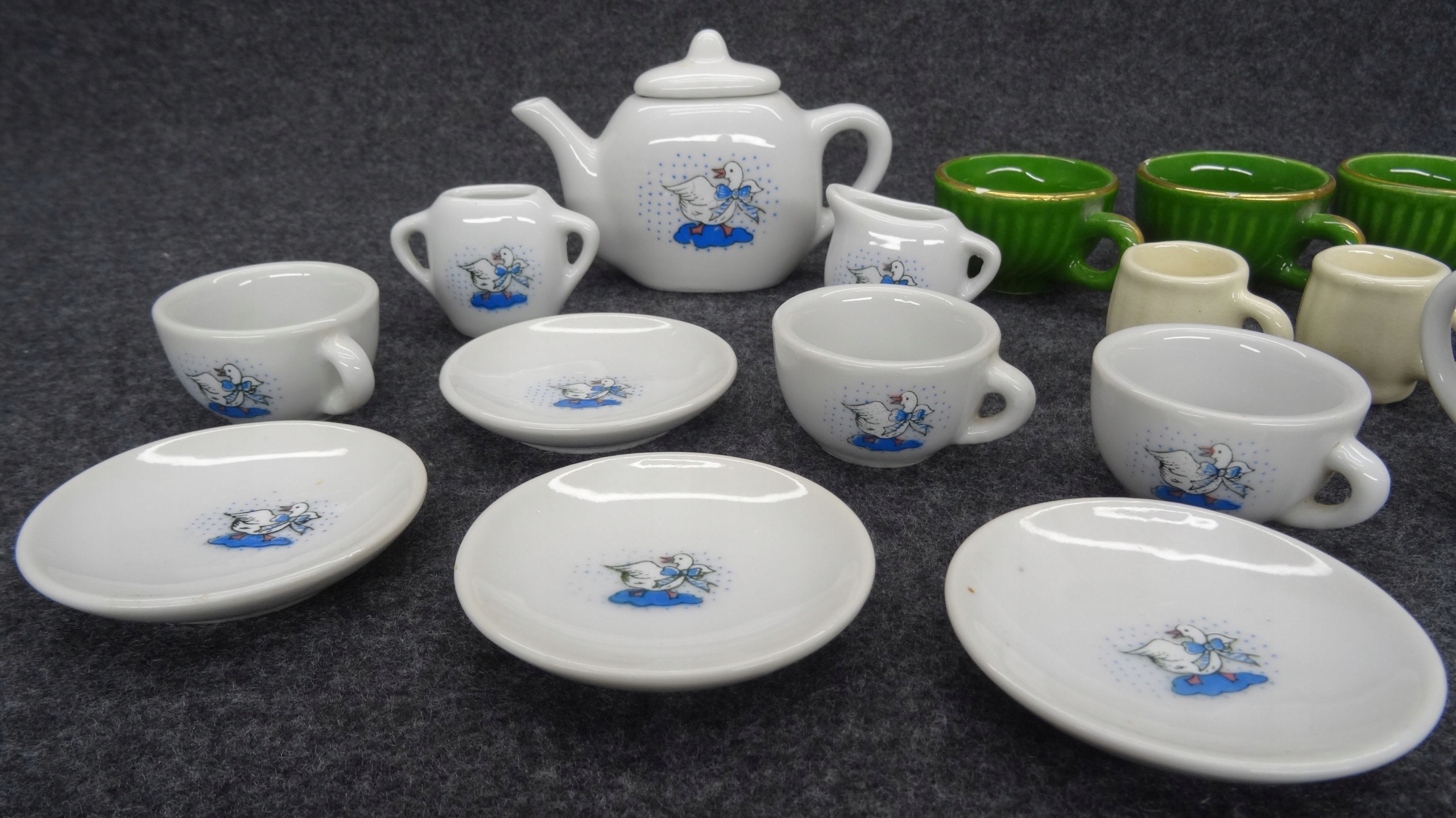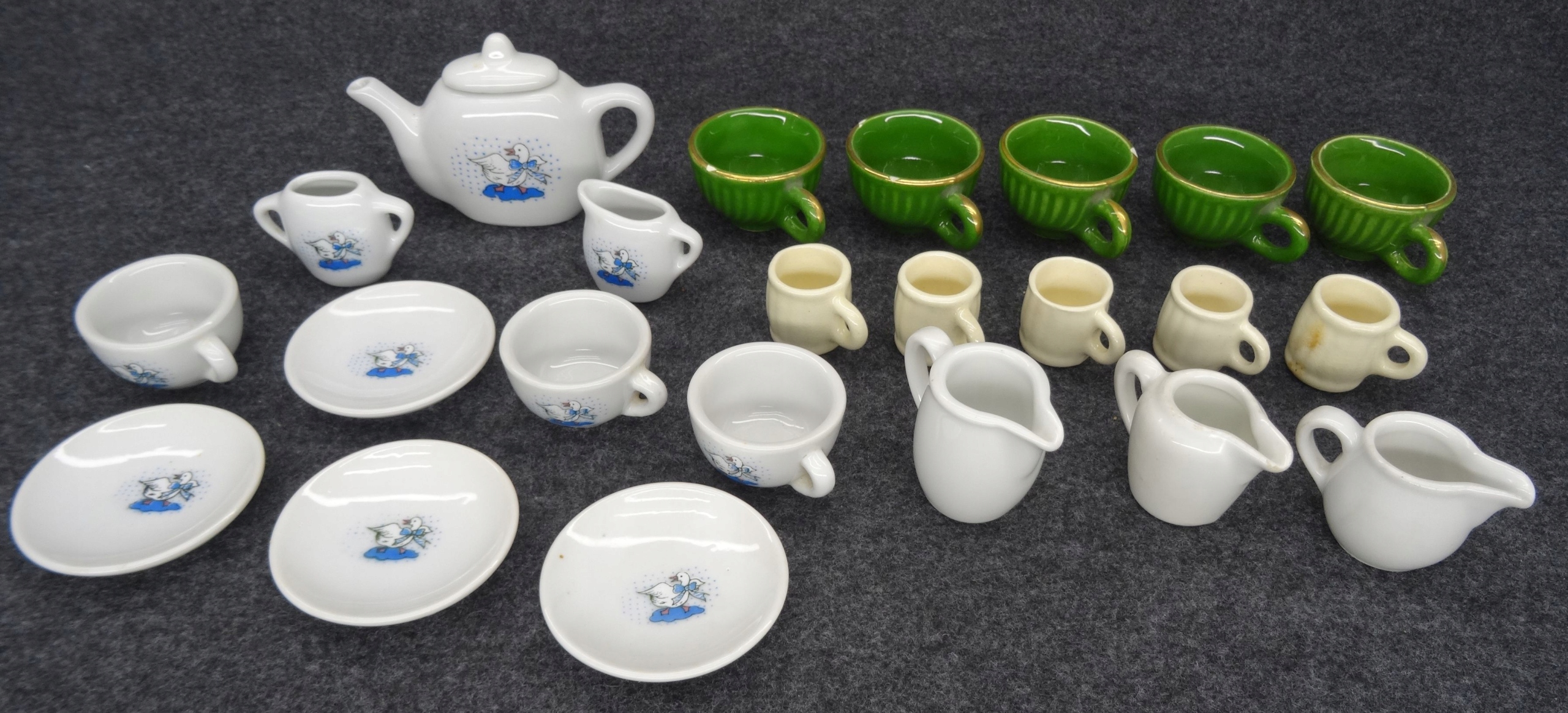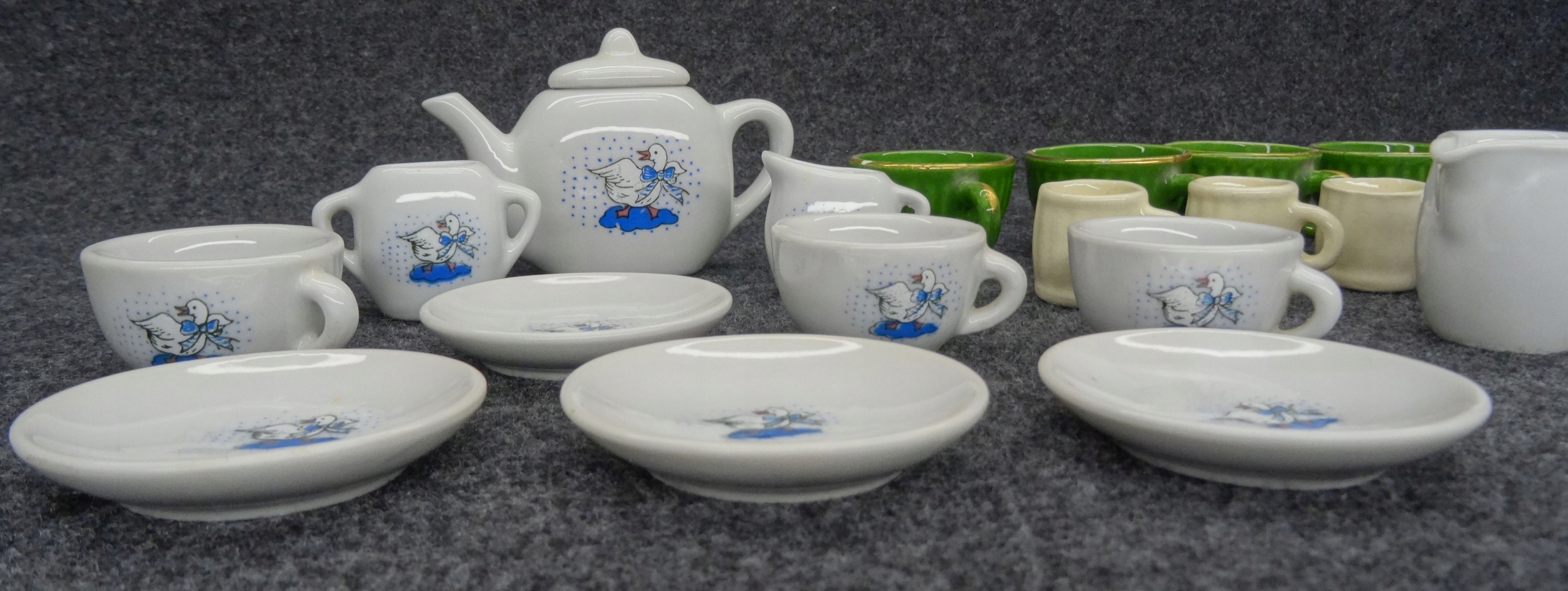 Набор миниатюрной посуды, например, для кукольного домика. Фарфоровые и керамические изделия. Три произведения с подписями, видимыми на фотографиях. В комплект посуды входят: фарфоровый сервиз с росписью гусей; чайник, молочник, сахарница, 3 чашки, 4 подставки, три подписанных фарфоровых кувшина, 5 керамических кружек, 5 керамических чашек.