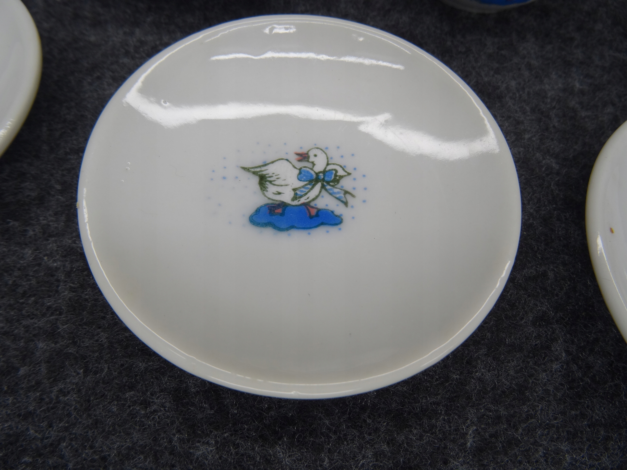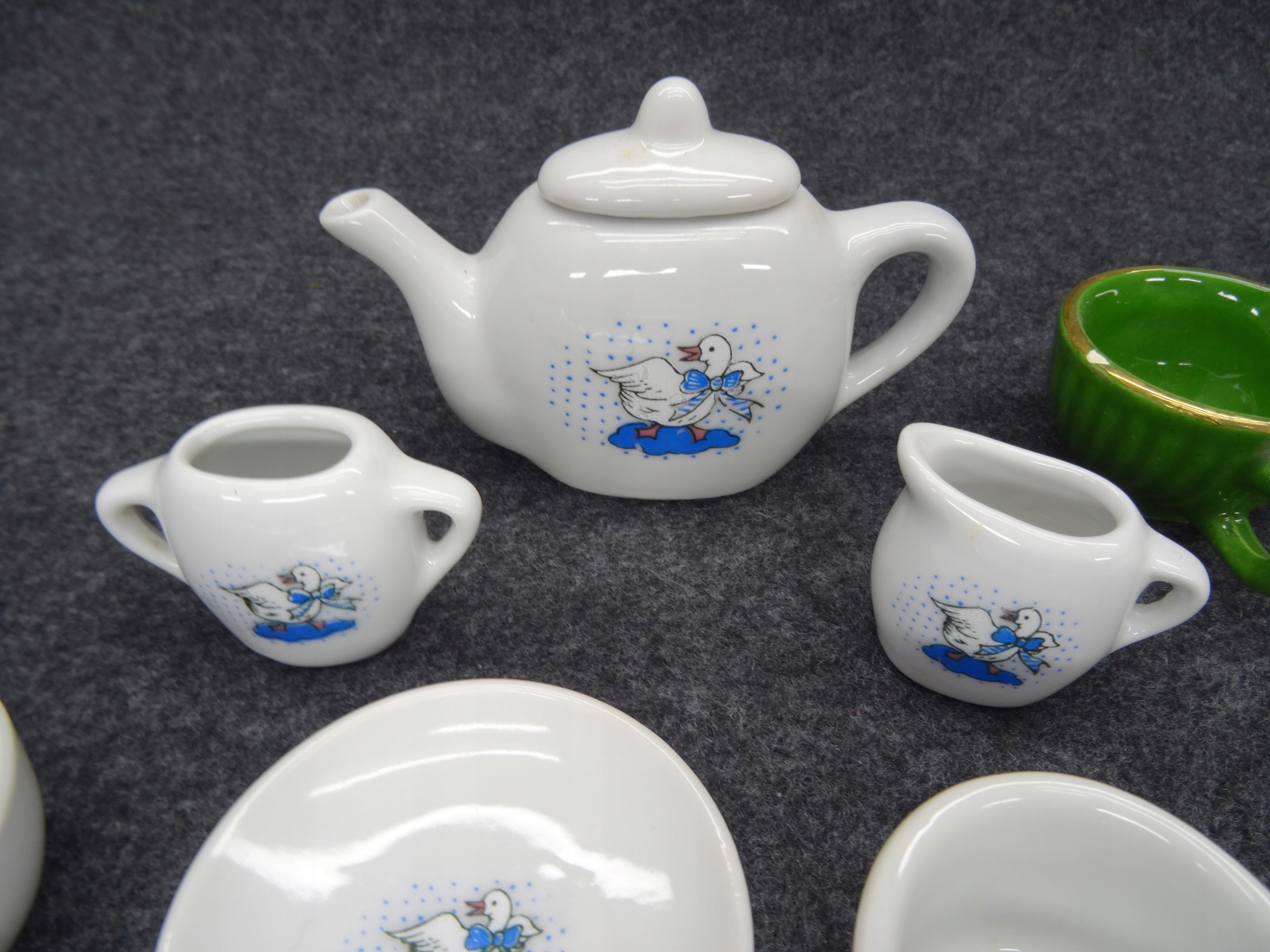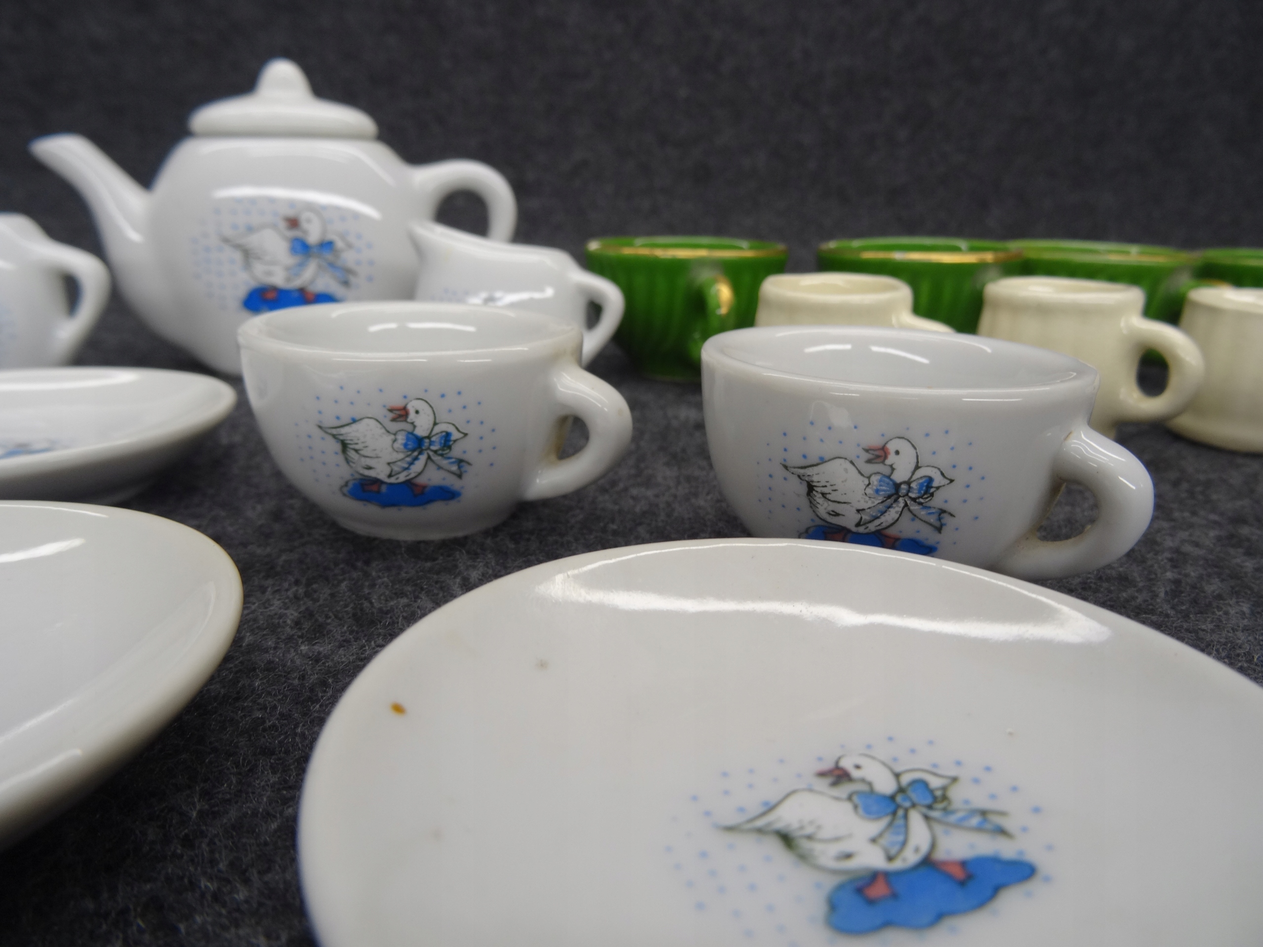Набор миниатюрной посуды, например, для кукольного домика. Фарфоровые и керамические изделия. Три произведения с подписями, видимыми на фотографиях. В комплект посуды входят: фарфоровый сервиз с росписью гусей; чайник, молочник, сахарница, 3 чашки, 4 подставки, три подписанных фарфоровых кувшина, 5 керамических кружек, 5 керамических чашек.