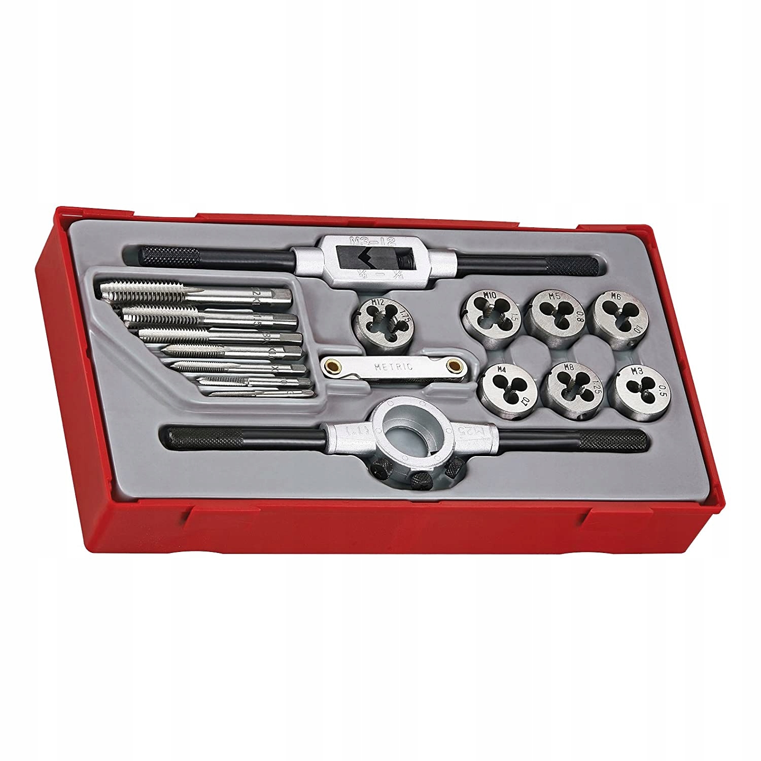 Набор из 17 предметов, содержащий по одному метчику и плашке каждого размера, а также ручку метчика и держатель плашки, резьбомер. Поставляется в пластиковом системном контейнере со съемной крышкой. Подходит для ящиков для инструментов и тележек Teng Tools. Подходящие запасные матрицы и метчики