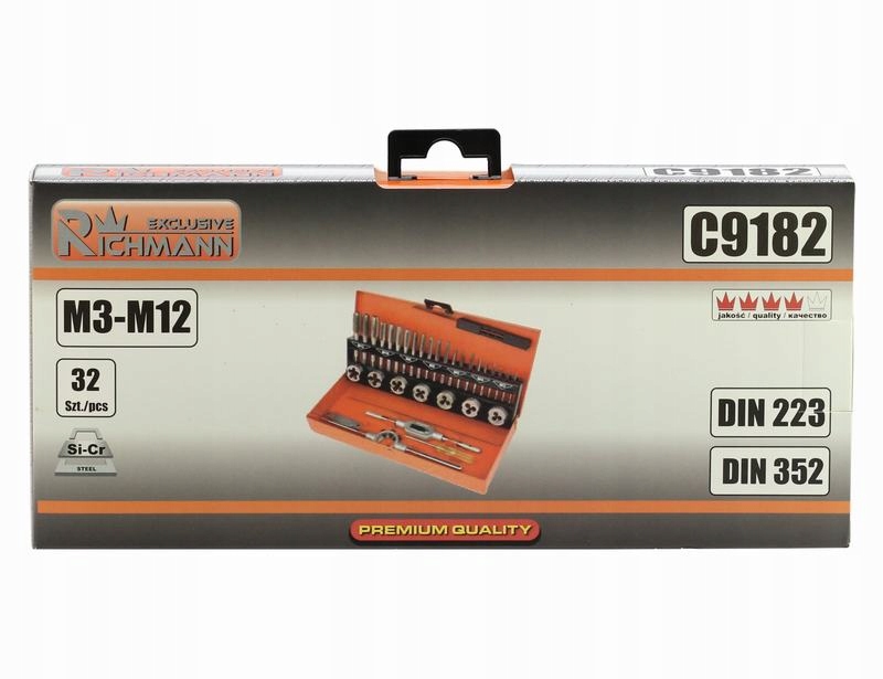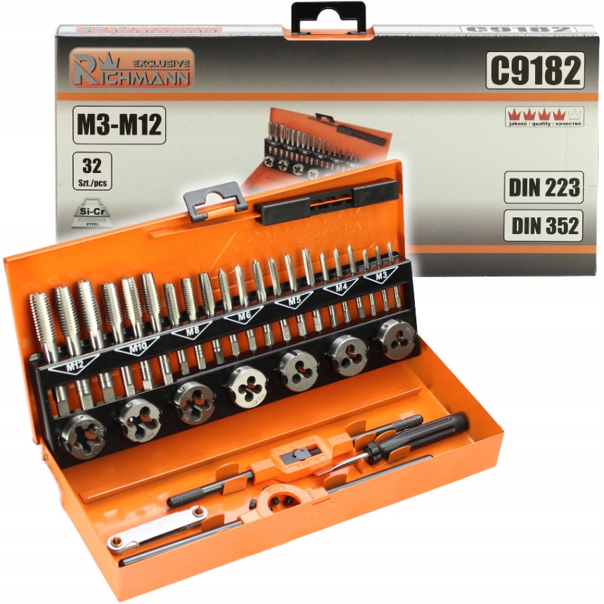 Эксклюзивная модель Richmann C9182 посвящена всем промышленным, мастер -классам или хобби. Набор может быть успешно использован как для резьбы, так и для восстановления внутренних и внешних потоков. Набор включает в себя все необходимые ручки для девяти и потоков, а также металлический почтовый ящик для хранения и транспортировки инструментов.