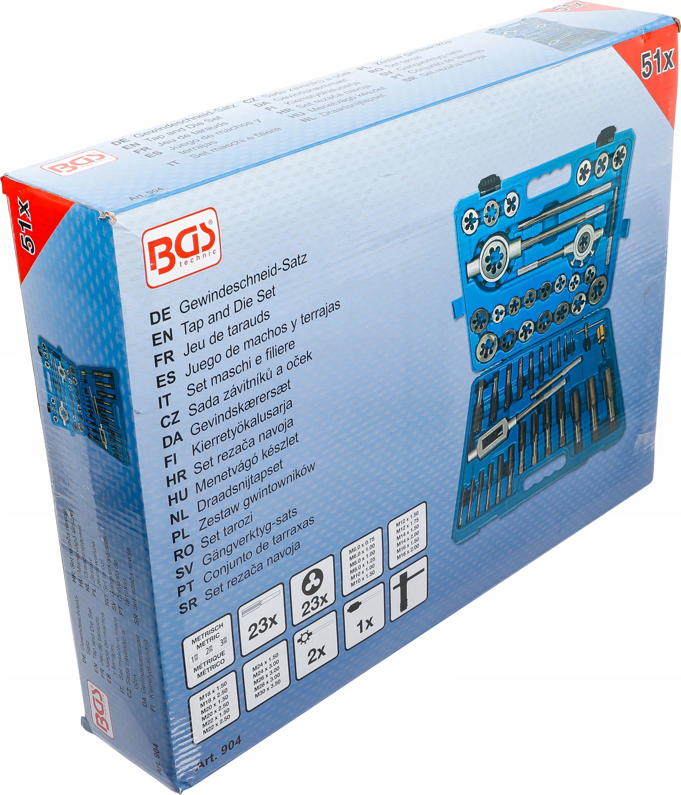 - 23 метчика и 23 матрицы, M6 x 1,0, M6 x 0,75, M8 x 1,25, M8 x 1,0, M10 x 1,5, M10 x 1,25, M12 x 1,75, M12 x 1,5, M14 x 2,0, M14 x 1,5, M16 x 2,0, M16 x 1,5, M18 x 2,5, M18 x 1,5, M20 x 2,5, M20 x 1,5, M22 x 2,5, M22 x 1,5, M24 x 3,0, M24 x 1,5, M26 x 3,0, M28 x 3,0, M30 x 3,5