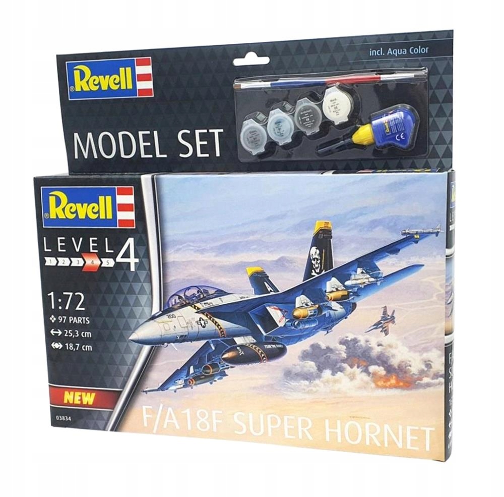 Набор для лепки с аксессуарами (4 основные краски, кисть, клей). F/A-18F Super Hornet — американский сверхзвуковой многоцелевой самолёт ВМС США. Рекомендуемые цвета краски: 32115, 32136, 32148, 32165, 32167, 32168, 32176, 32183, 32199. Набор пластиковых моделей Revell (REV-63834). Спецификация Номер по каталогу: REV-63834 Производитель: Revell Длина: 253 мм Размах крыльев: 187 мм Высота: 67 мм Масштаб: 1:72 Уровень сложности: 4 Количество элементов: 87 Инструкция: да Возрастная группа: 12+