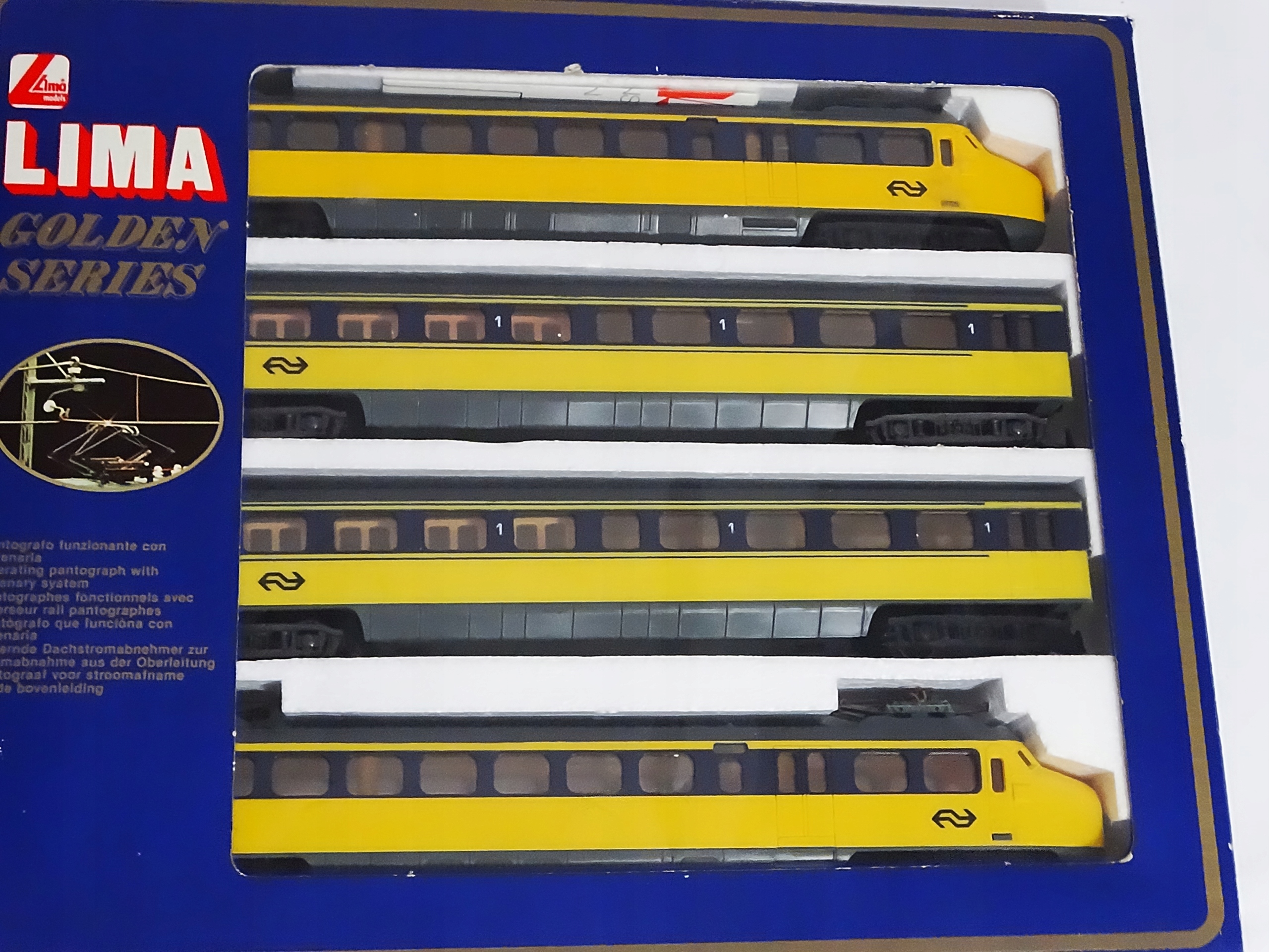 Набор моделей железных дорог из золотой серии LIMA, на которых изображен голландский пассажирский поезд NS (Nederlandse Spoorwegen) в классической желто-синей окраске. Это настоящий праздник для любителей железных дорог и моделиостроения H0.