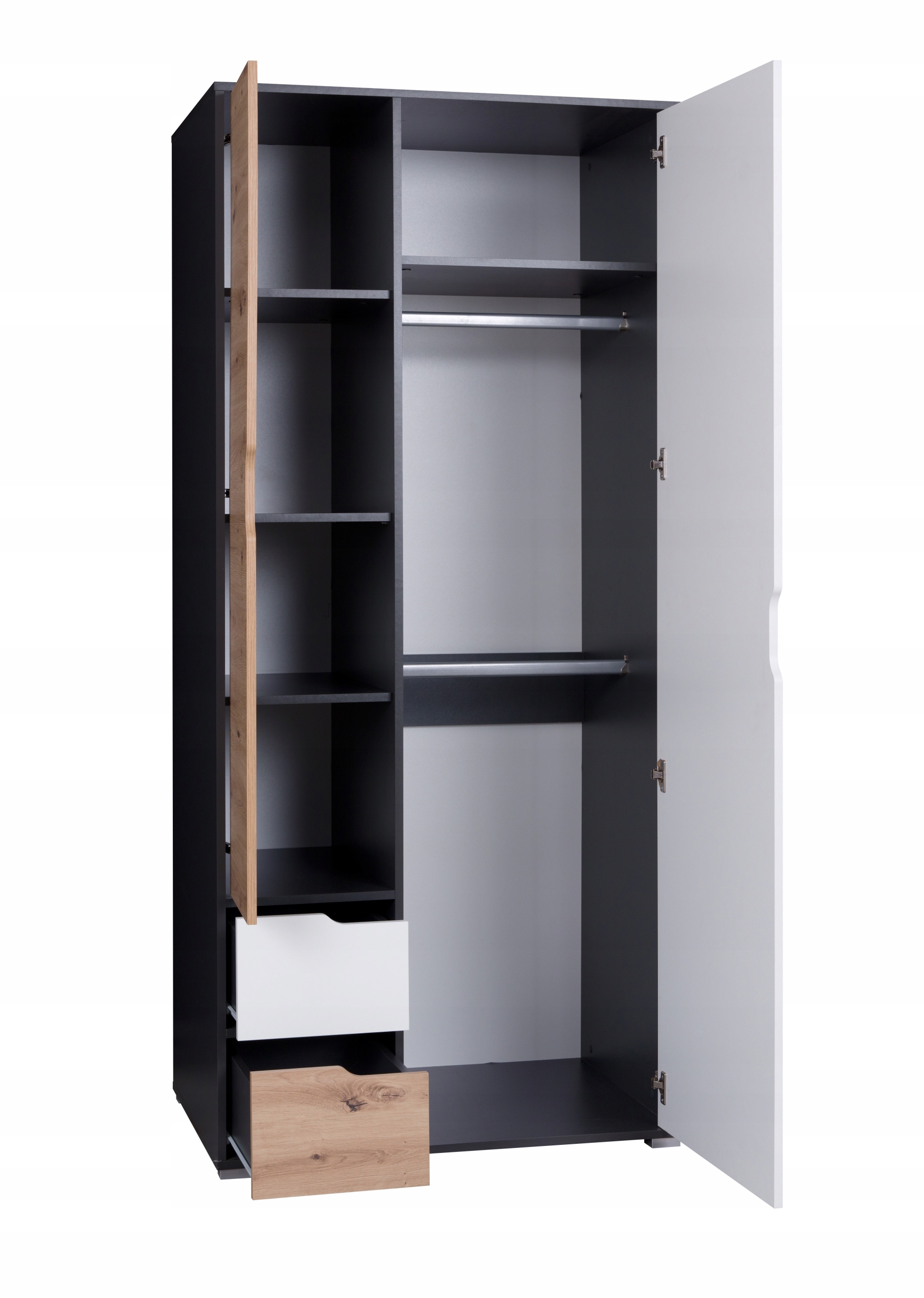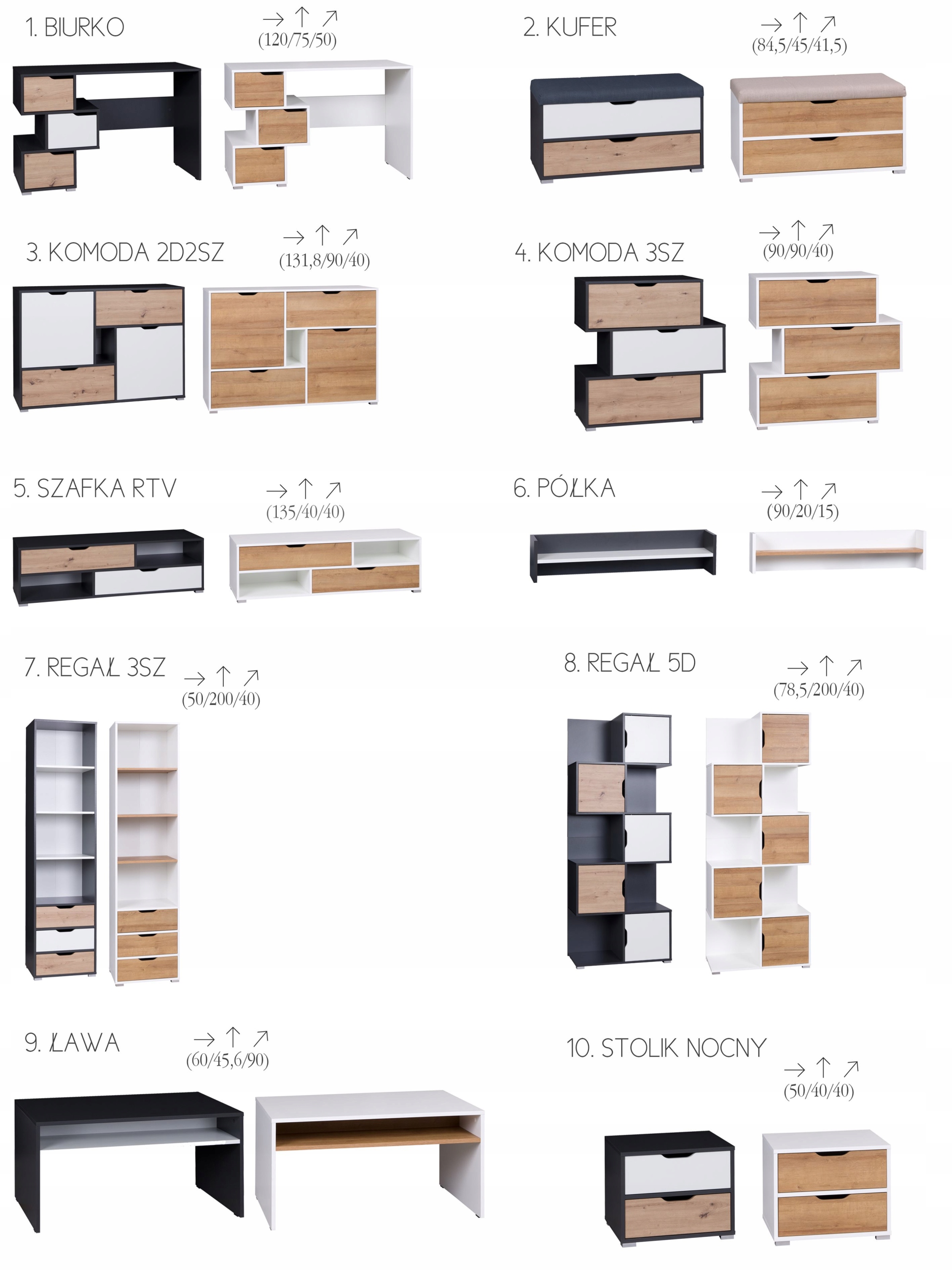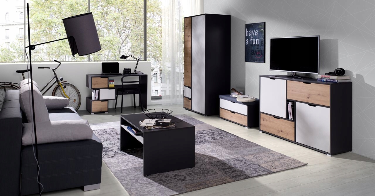 Это коллекция, посвященная молодежи, но эта мебель ярких цветов также отлично подойдет для гостиной. Мебель двух темных цветов: графитовый корпус в сочетании с белым и ремесленным дубом на фасадах; и светлые белые корпуса и золотой дуб на фасадах. Светлые тона внесут в интерьер дыхание свежести и покоя, а темные позволят добавить немного безумия и игры контрастов.
