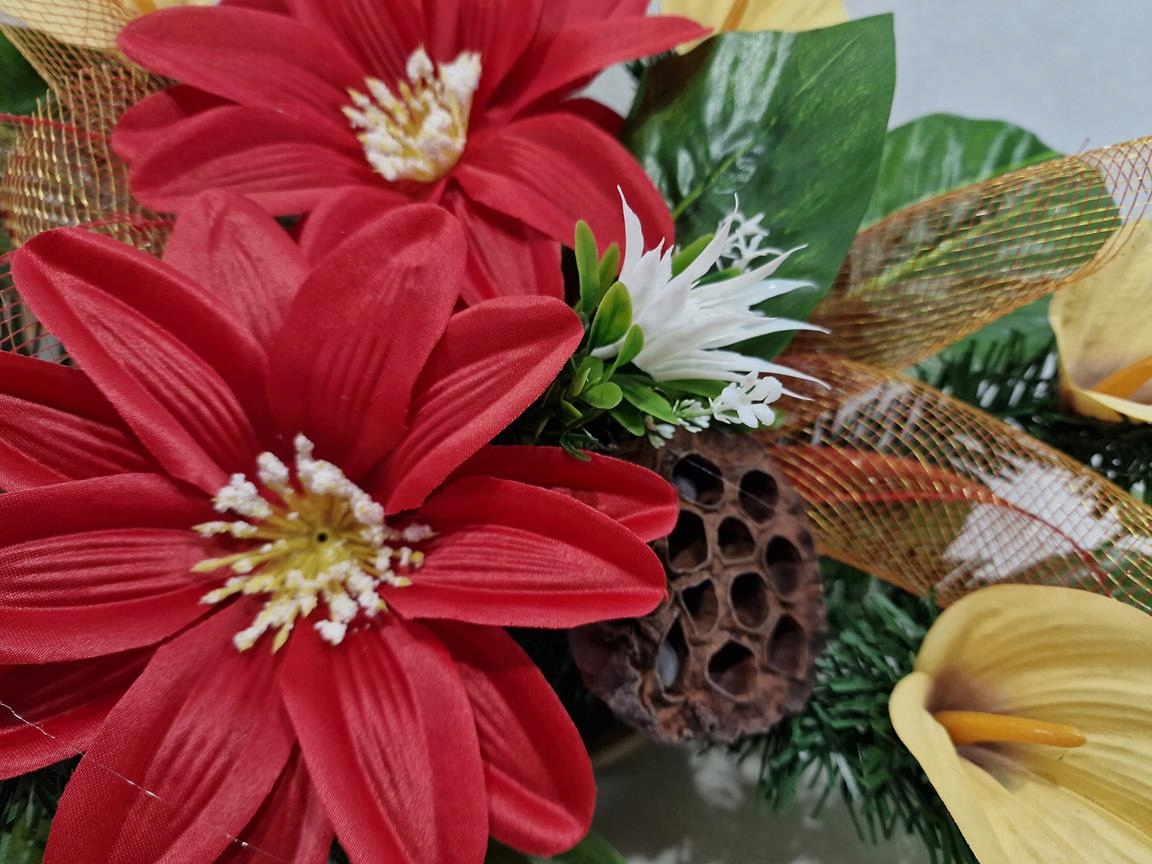 Украшение в комплекте с вазой-вставкой из искусственных цветов в горшке, наполненном бетоном.