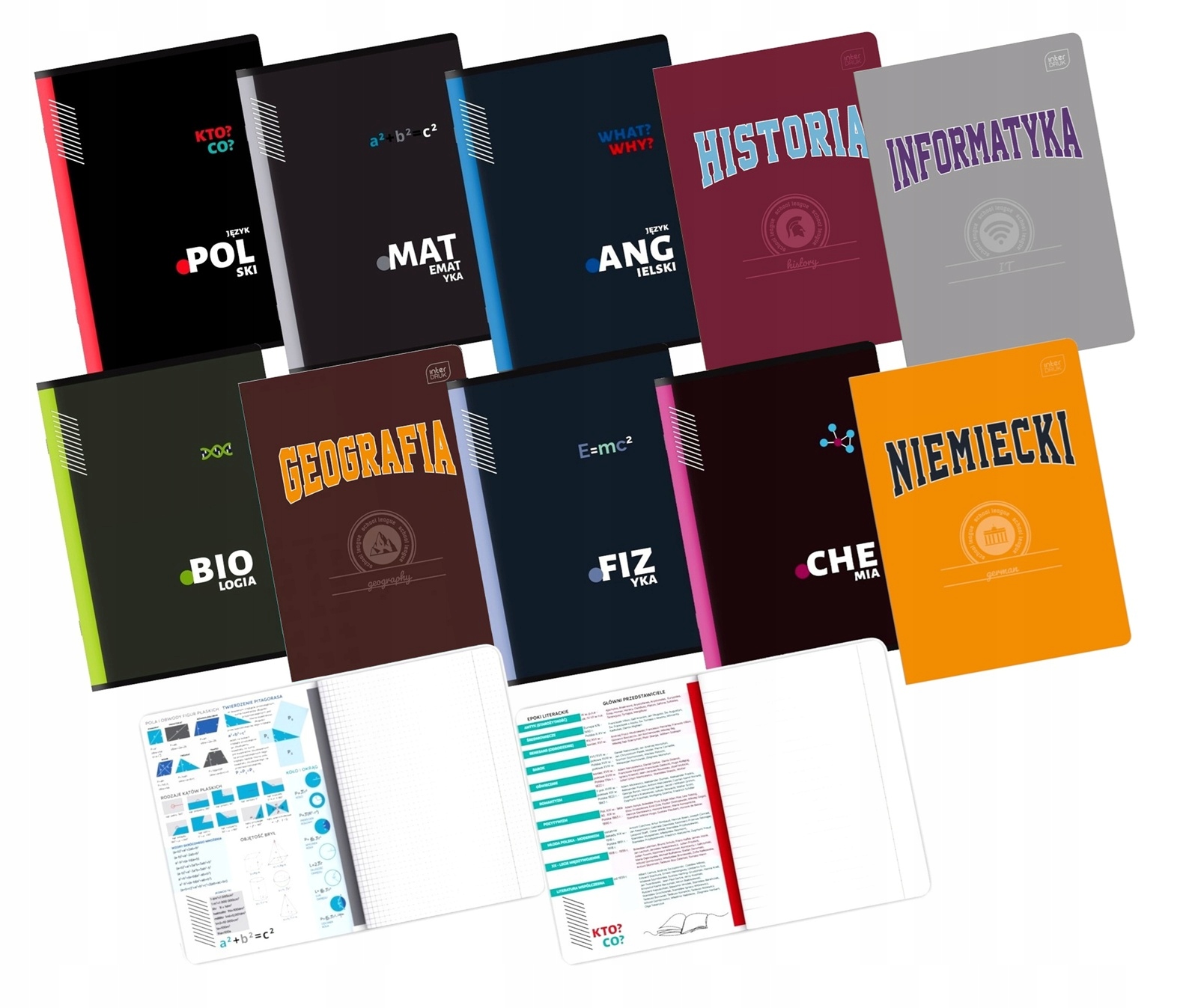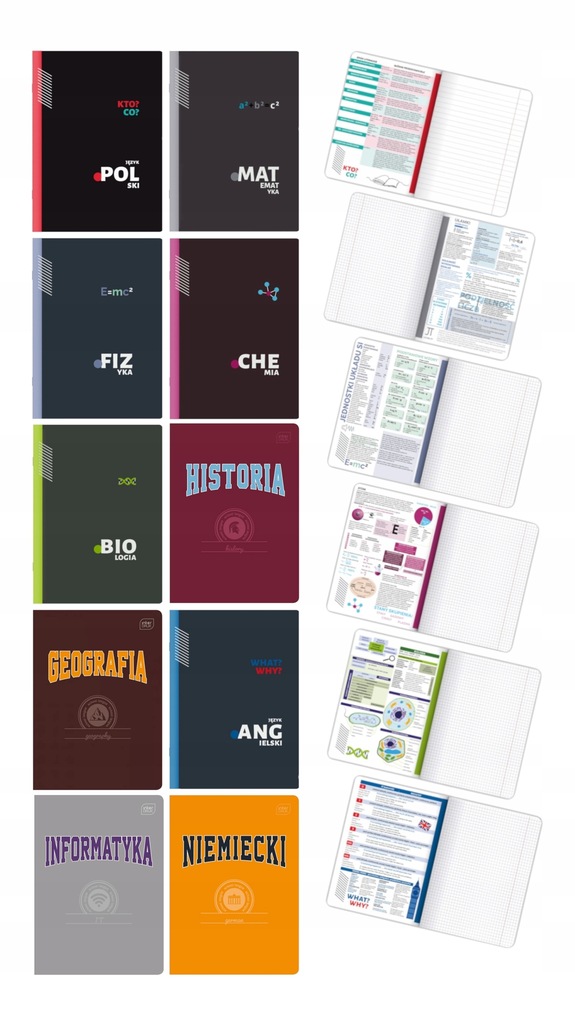 - Карточки: внутренние обложки содержат подготовленные специалистами шпаргалки, позволяющие разместить самую важную информацию на 2 страницах. Благодаря этому они всегда будут у вас под рукой. В истории вы найдете самые важные даты из истории Польши, в химии таблицу Менделеева и в английском языке, среди прочего: базовое спряжение неправильных глаголов.