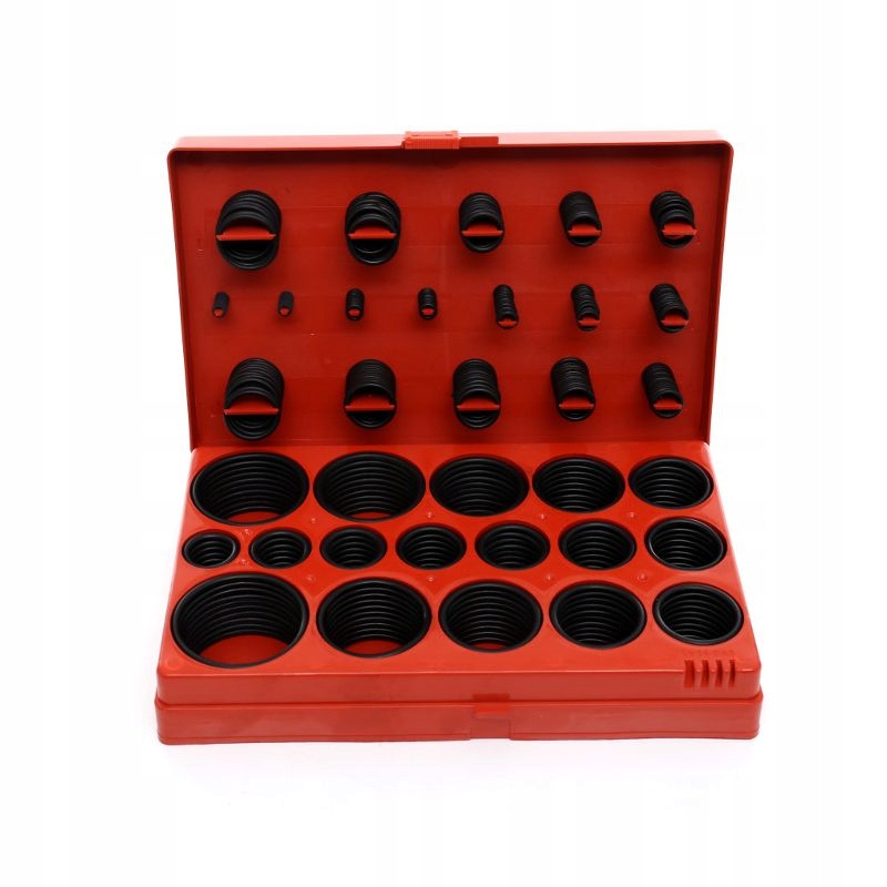 Целое упаковано в пластиковый контейнер, в котором каждый размер уплотнения имеет свое отмеченное место