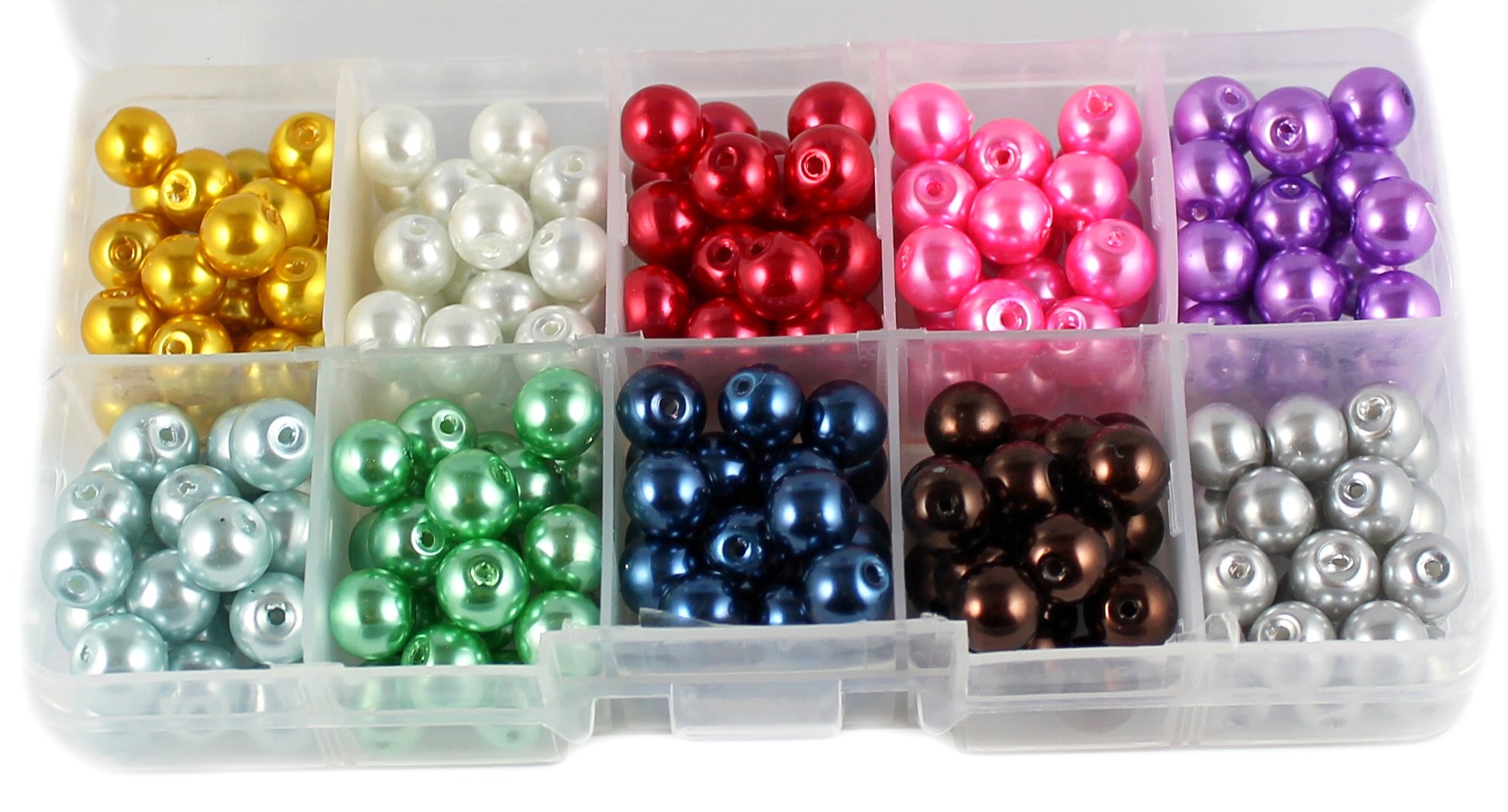 Бусины в органайзере — стеклянные жемчужные бусины диаметром 8 мм.