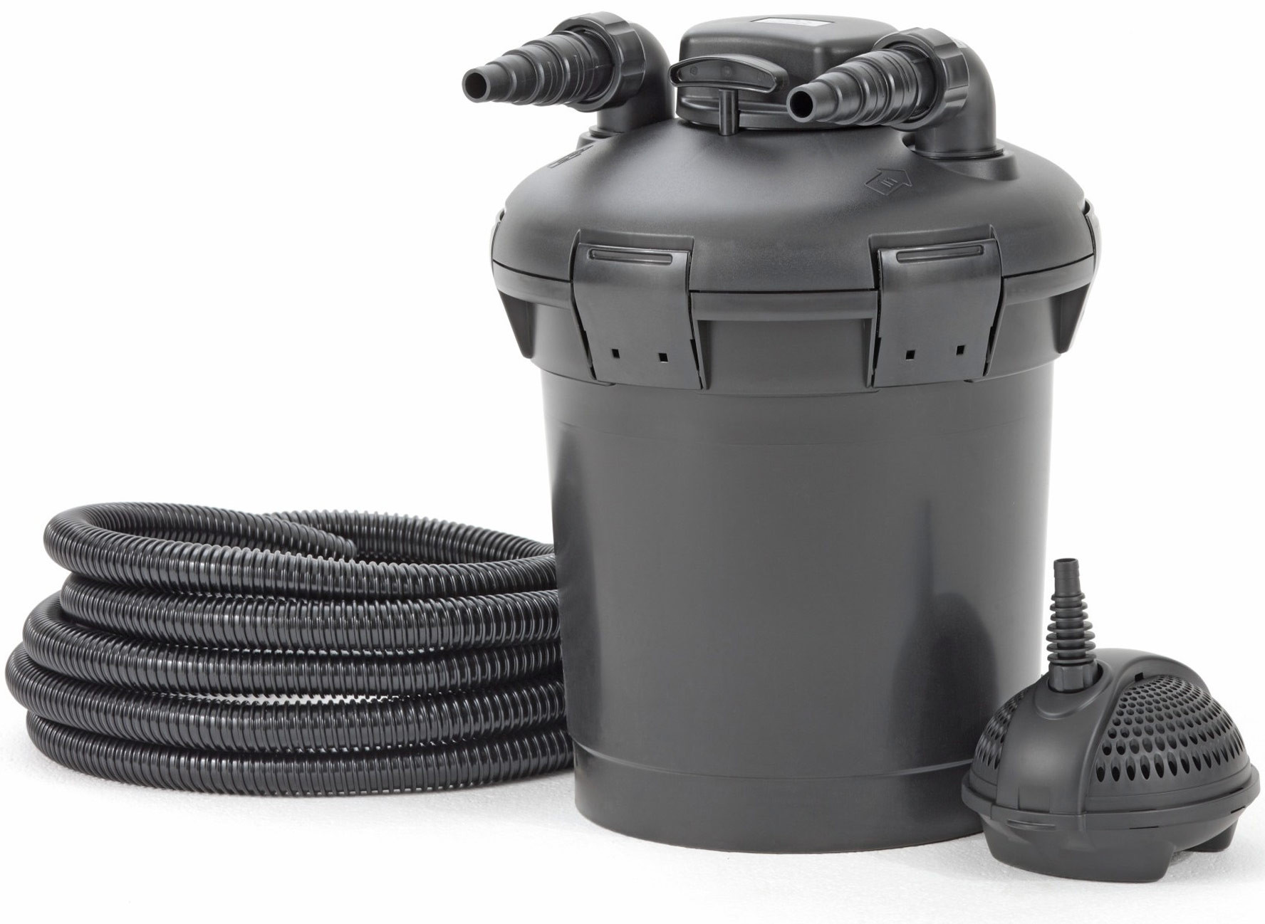 Гарантированная чистая вода: напорный фильтр PondoPress адаптирован к размерам прудов до 10 000 л без зарыбления рыбой / 5000 л с рыбной зарыбкой. Комбинация напорного фильтра и соответствующего насоса предварительной очистки очищает пруд от крупных частиц грязи размером до 4 мм. Питательные вещества и мутная вода надежно удаляются встроенным 9-ваттным УФ-стерилизатором и биомеханическим фильтрующим материалом. Напорный фильтр имеет достаточную мощность для транспортировки очищенной воды на высоту до 2,2 м и подачи потока. В комплект входит шланг длиной 4,5 м. Наше обещание качества: гарантия 2 года!