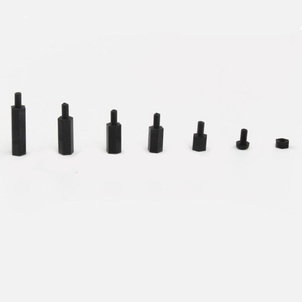 Набор из 120 винтов и дистанционных втулок разных размеров из черного нейлона. Нейлон не подвержен ржавчине, очень прочен и хорошо выглядит. Этот материал очень часто используют для производства зубчатых передач, где материал должен быть устойчив к нагрузкам. Все элементы изготовлены с высокой точностью, с точной резьбой, без заусенцев и т.п.