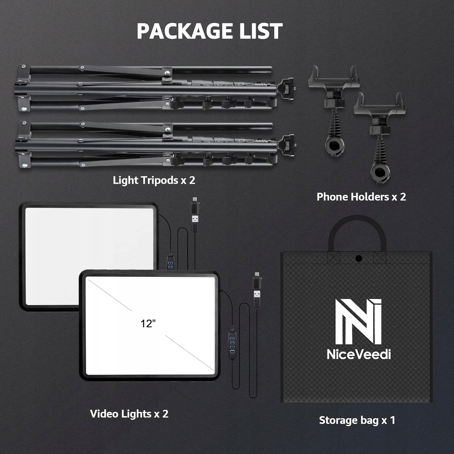 В комплекте: 2 светодиодных лампы, 2 шт. штативы, держатель для телефона, сумка для хранения