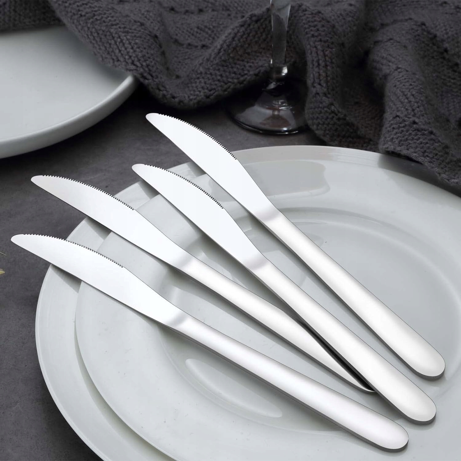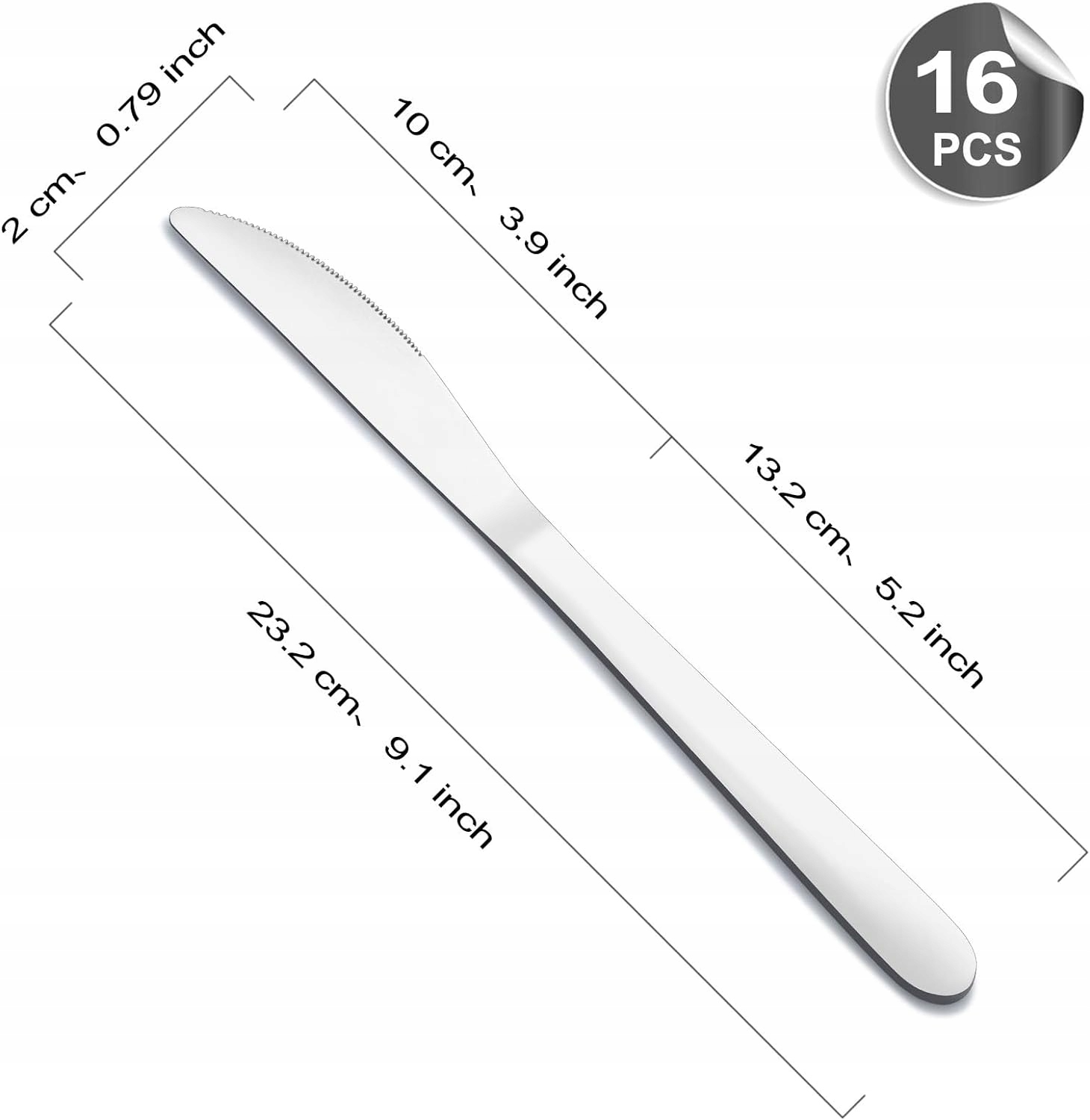 16 серебряных столовых ножей изготовлены из высококачественная нержавеющая сталь, которая прочна и долговечна. Классический дизайн и элегантный стиль ножей подойдут к вашей уже имеющейся посуде. Эти столовые ножи идеально подходят для семей, вечеринок, развлечений, ресторанов, отелей, общественного питания, свадеб, кемпинга и т. д.