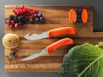 Для одевания игры. Набор из 2-х ножей с точилкой, продается в кейсе. 1 нож для разделки и 1 нож для разделки и обвалки тушек.
