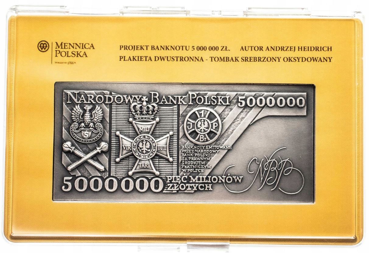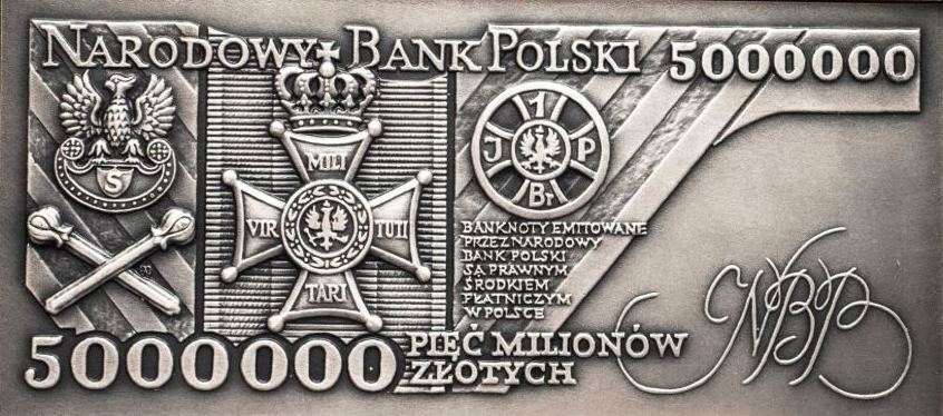 Представленный значок является копией банкноты номиналом 5 000 000 злотых 1995 года выпуска. Дизайн этой банкноты разработал Анджей Мейдрич. Представленная ниже банкнота не является предметом аукциона.