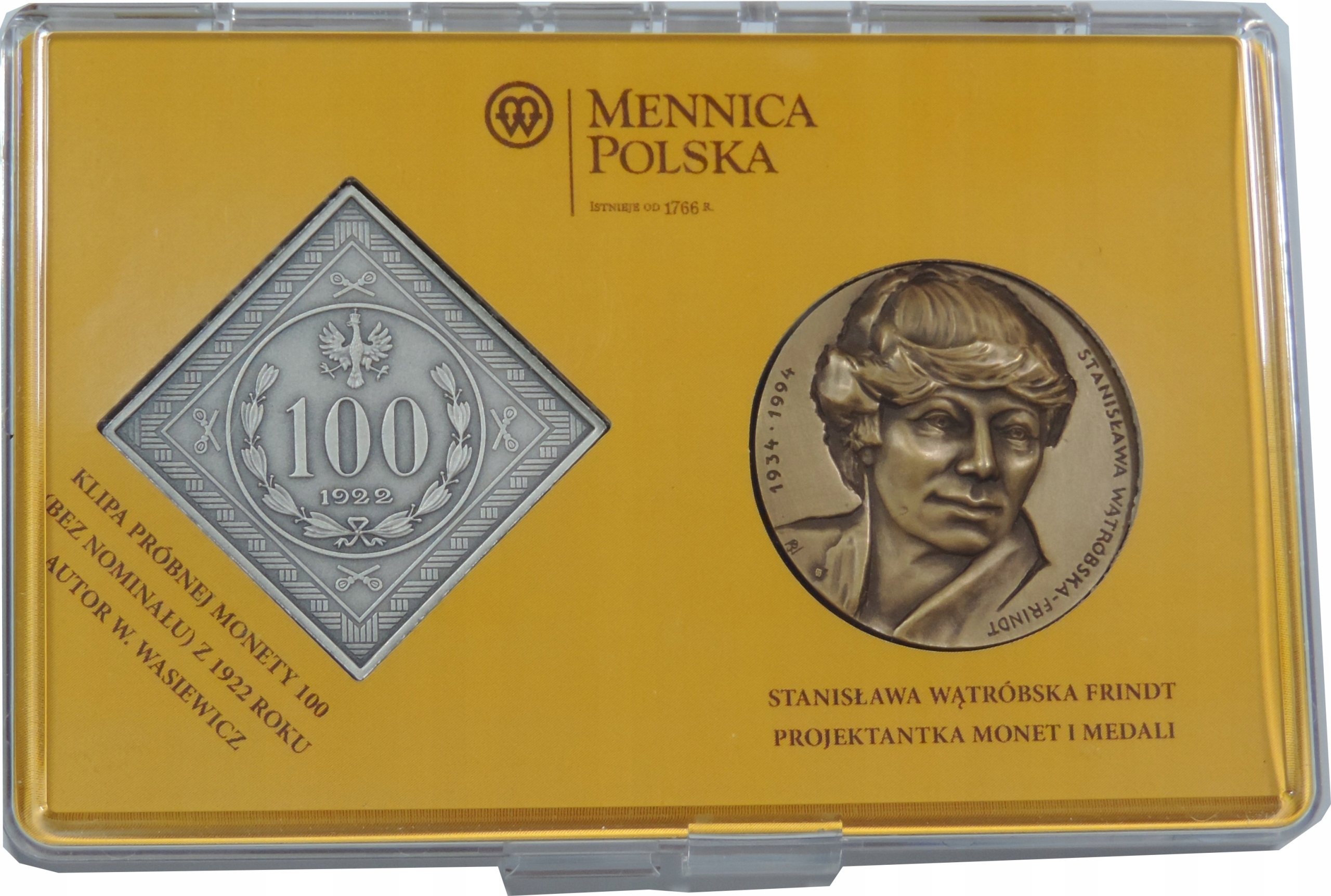 - НАБОР № 2 – ОБРАЗЕЦ КЛИПСА ДЛЯ МОНЕТ 100 (без номинала) с 1922 г. + ДВУСТОРОННЯЯ МЕДАЛЬ (аверс Юзеф Пилсудский, реверс Станислава Вонтрубска-Фриндт, дизайнер монет и медалей)