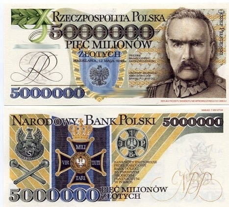 - НАБОР № 1 – ОКИСЛЕННАЯ МОНЕТА 5 МИЛЛИОНОВ ЗЛЫХ 2008 ГОДА ПИЛСУДСКОГО (реплика банкноты номиналом 5 000 000 злотых 1995 года)