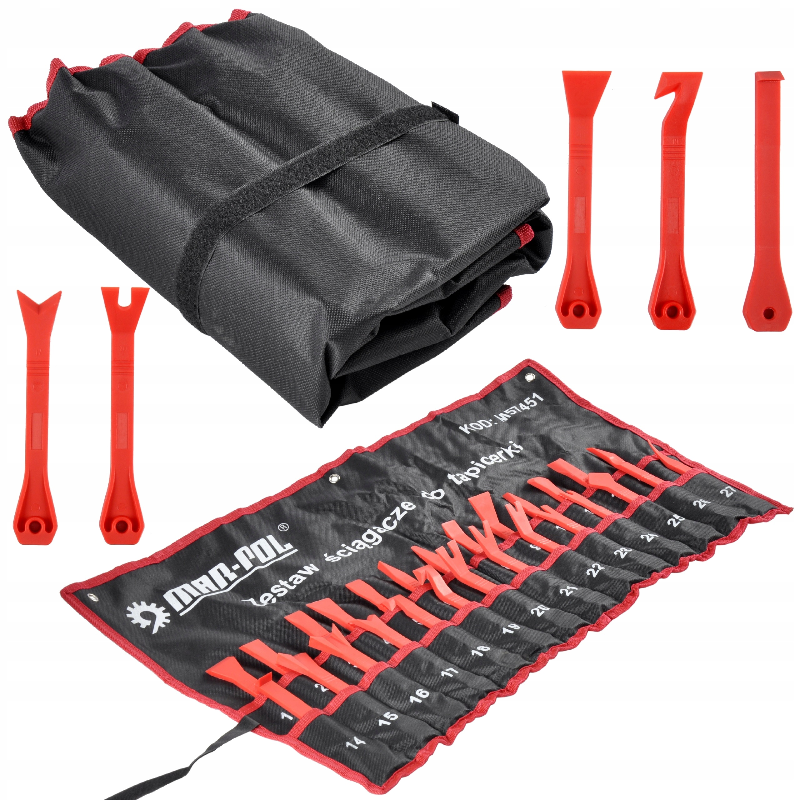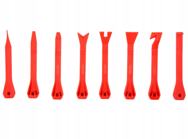 Набор будет использоваться в мастерских и механике из листового металла. Изготовлен из нейлона гарантирует безопасность использования для отдельных пластиковых элементов. У них есть специальные профили, позволяющие использовать рычаги при демонтаже запонок обивки.