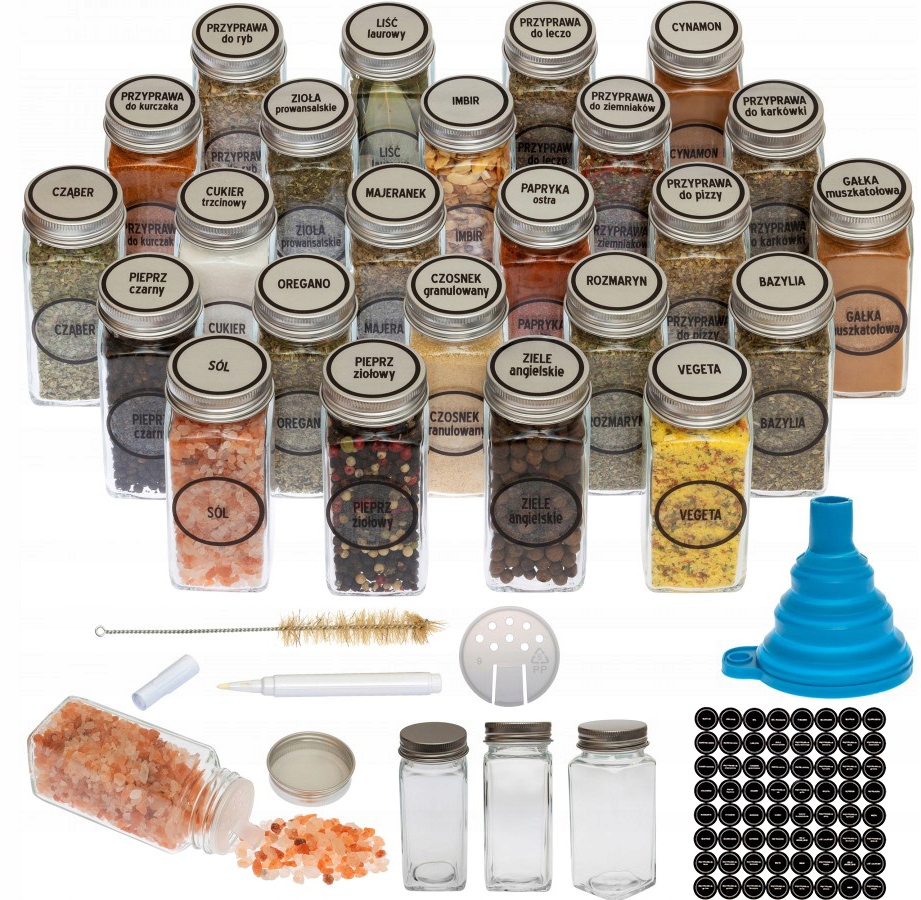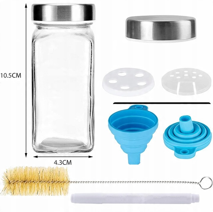 Кроме того, вы получите 48 пустых этикеток, на которых можно писать меловым маркером, а также щеточку для чистки и складную силиконовую воронку.
