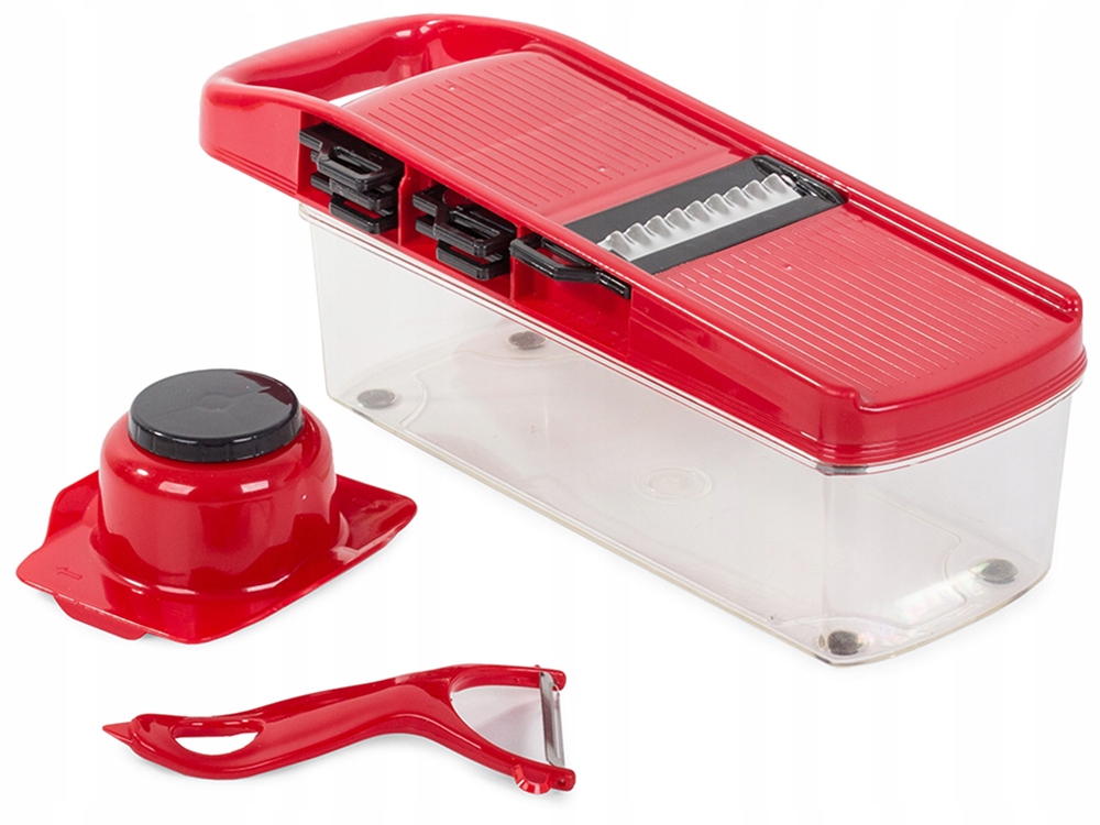 В комплект входят шесть сменных лезвий, ручка и ножовка. Контейнер имеет нескользящие ножки, обеспечивающие устойчивое положение при натирании овощей.