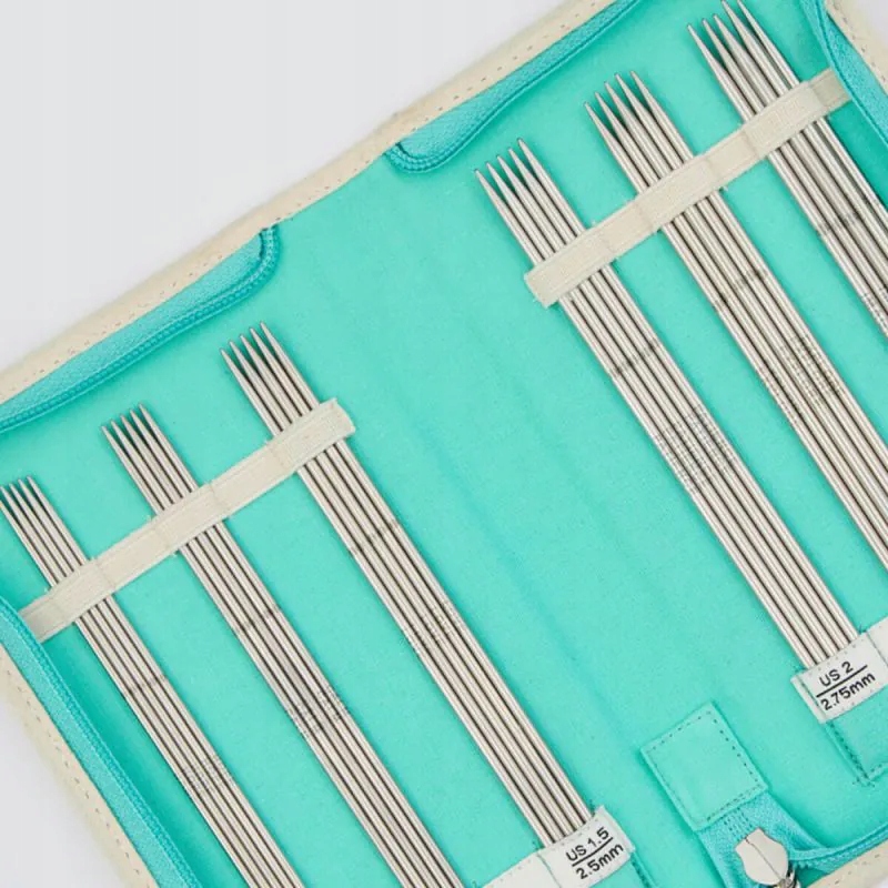 Graby Set представляет собой набор из 5 чулочно -носочных проводов в 6 размерах.  Они изготовлены из нержавеющей стали, упакованной в аккуратный корпус, прикрепленный на молнии и сумку с мотивом мандалы с цветочной мандалой. Металлические провода легкие и долговечные. Гладкая поверхность и заостренные наконечники обеспечивают удобное вязание от всех видов пряжи.