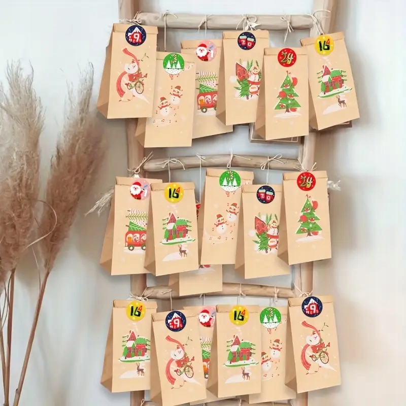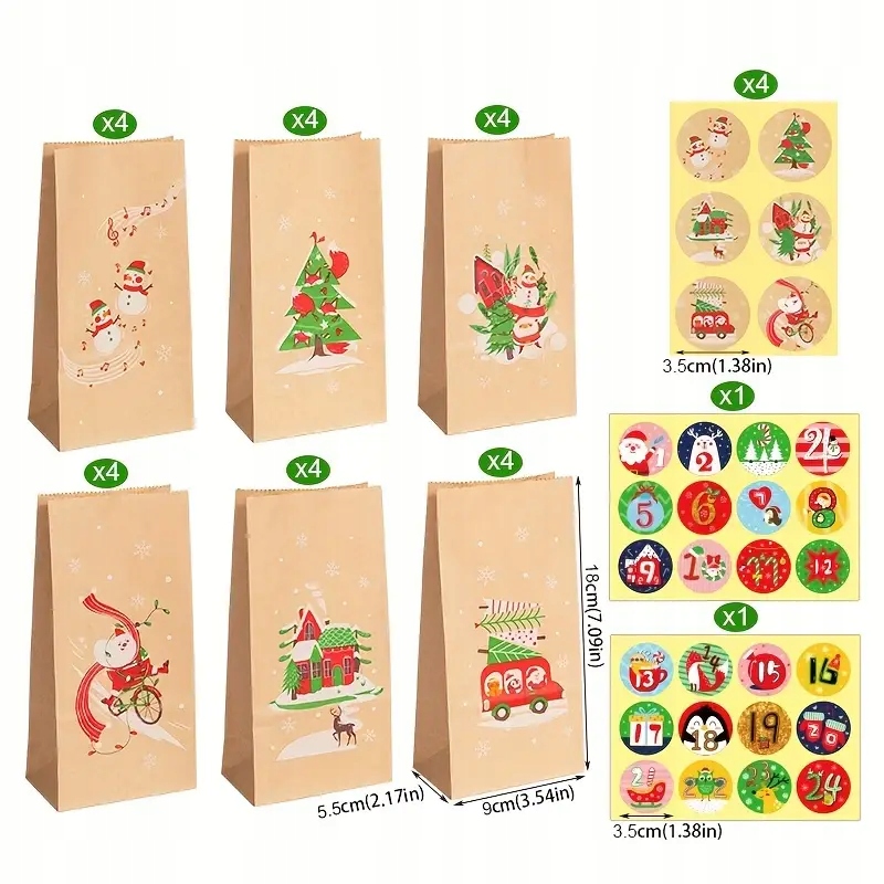 НАБОР БУМАЖНЫХ ПАКЕТОВ 9x18 ПОДАРОЧНЫХ НАКЛЕЙКОВ ДЛЯ АДВЕНТ-КАЛЕНДАРЯ 24 шт.