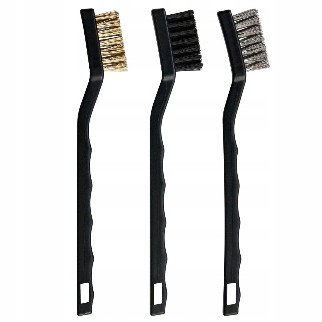 Проволочные щетки, набор из 3 кистей. Для очистки твердых поверхностей от ржавчины, краски, пыли и других легких загрязнений. Щетка профилирована для повышения эффективности очистки. Щетки из стали, нейлона и латунной проволоки. Отверстие в подвесной ручке позволяет повесить кисти.