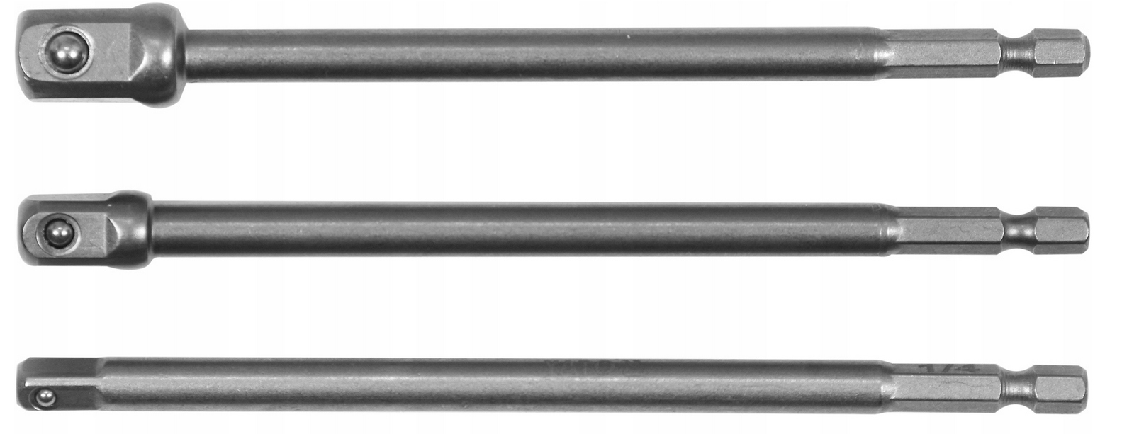 Адаптеры изготовлены из прочной хромованадиевой (CrV) стали. Набор переходников позволяет использовать торцевые головки 1/2", 3/8" и 1/4" с дрелью/отверткой с шестигранной ручкой.