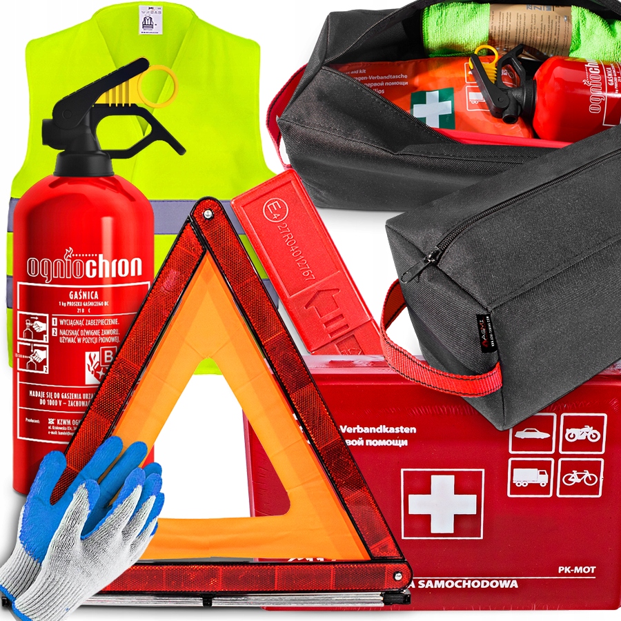 АПТЕЧКА ВОНЕГАСНИК ПЕРША АПТЕЧКА ЖИЛЕТ ТРИКУТНИК РУКАВИЧКИ СУМКА