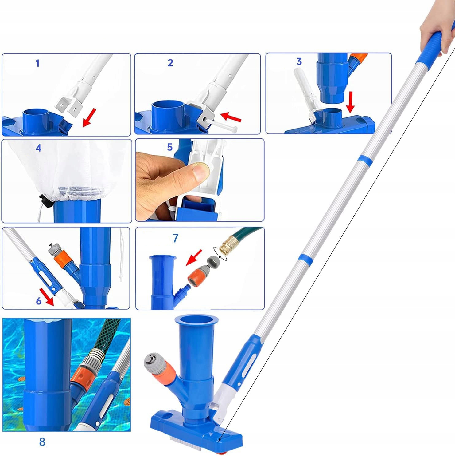 💧 Легкое обслуживание: не требует электричества, вакуумный очиститель бассейна достаточно, чтобы подключиться к стандартному садовому шлангу, и он работает. Вода в шланге попадает в вакуумный вход и создает эффект всасывания, а затем грязь, листья или песок высасываются непосредственно в сетку. Сила сосания зависит от давления воды и длины садового шланга.
