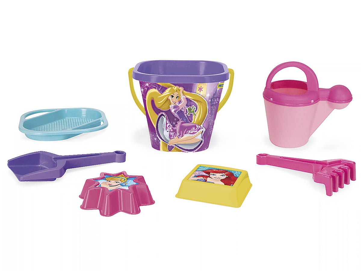 Серия лицензионной продукции Walt Disney - Принцессы. Игрушка производства Польши. Летний комплект из семи предметов. Принт популярных персонажей Диснея выполнен по технологии IML (In Mold Label), при которой используемая графика встраивается непосредственно в материал, поэтому является несмываемой.