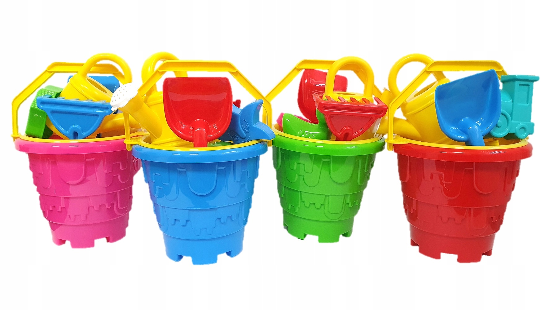 Наборы могут отличаться формой формочек и цветом лопатки и грабель.