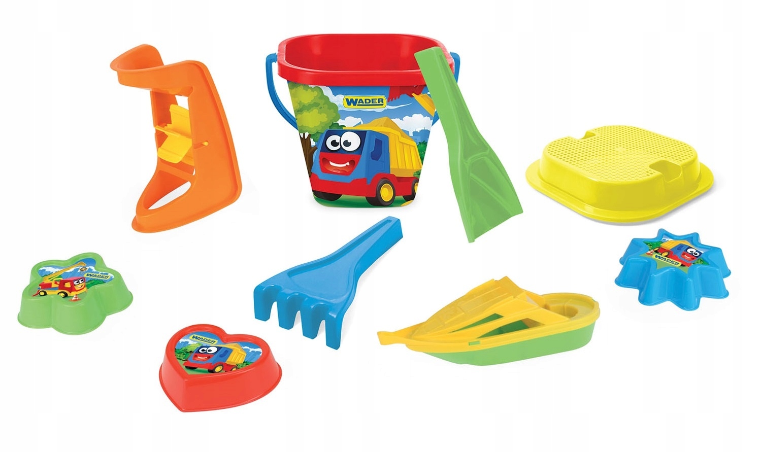 Летний набор, в который входят: квадратное ведро емкостью 2 литра, лопатка, грабли, ситечко, три формочки, моторная лодка и по желанию измельчитель или лейка. Ведро и формочки украшены наклейками, изготовленными по технологии IML, а это значит, что они прочно прикрепляются к игрушкам и устойчивы к разрывам и отслоениям под воздействием воды или температуры. Игрушки очень красочные и прочные. Каждый набор (с мясорубкой или лейкой) отличается разным цветом отдельных элементов.