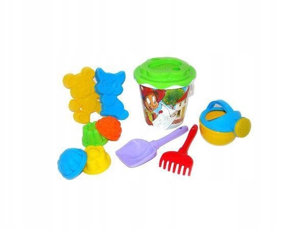 Набор песочницы: ведро с наклейкой, сито, лопатка, грабли, 6 формочек (в том числе 2 большие: котенок и мишка). ), лейка.