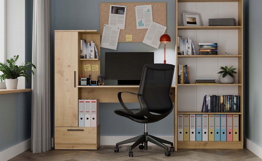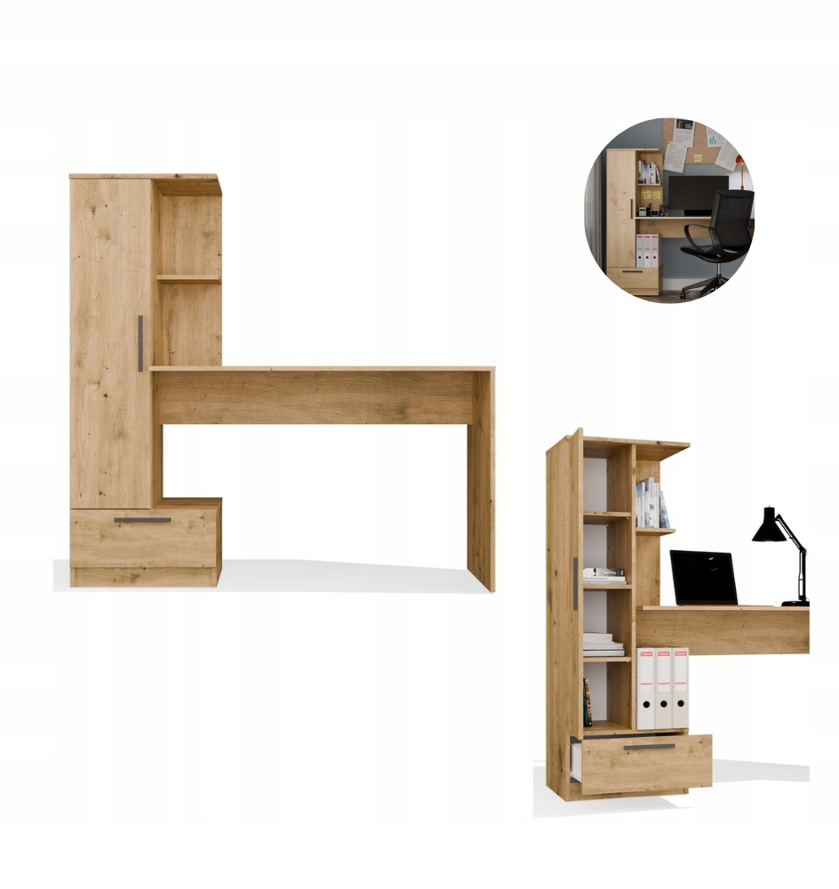 Письменный стол с полкой COSMO DĄB ARTISAN — функциональный комплект, сочетающий в себе современный стиль и практичные решения для повседневного использования. Благодаря компактному дизайну комплект хорошо подойдет для молодежной комнаты, домашнего офиса или студии.