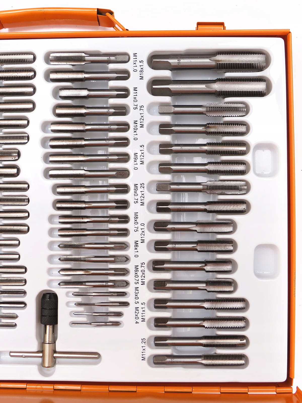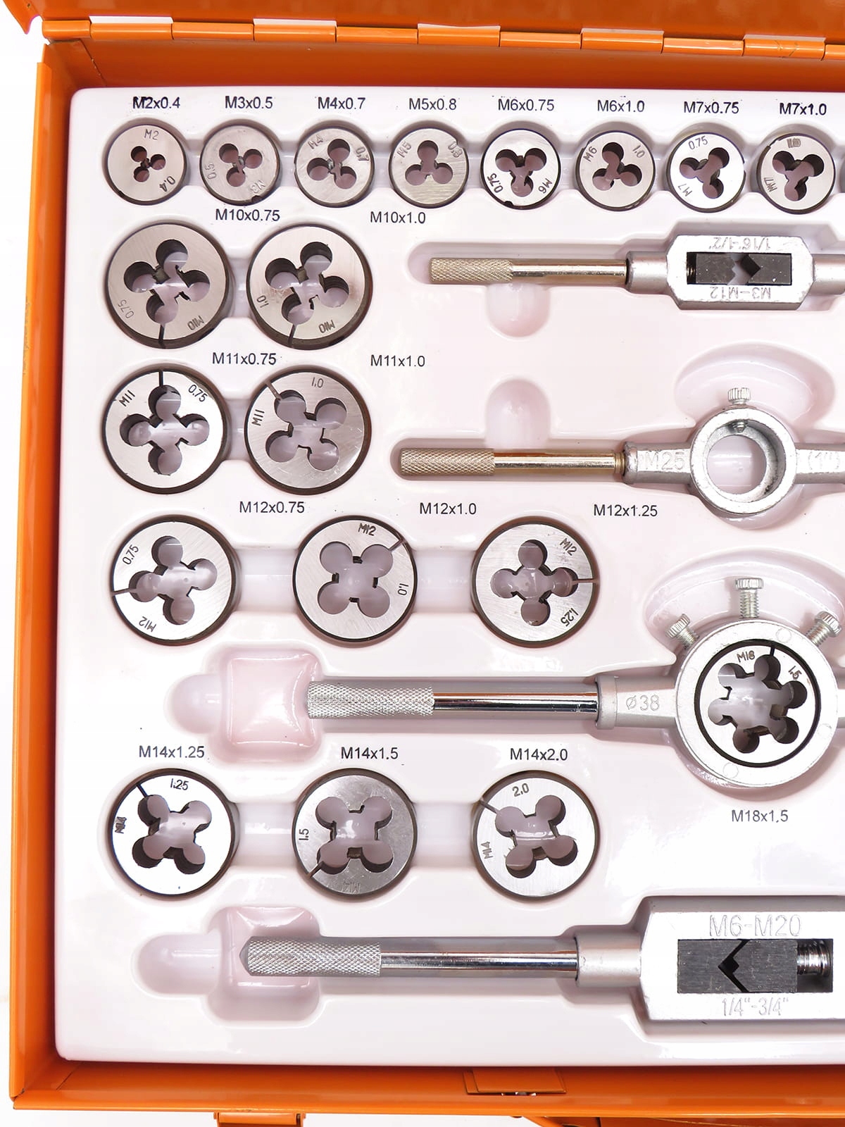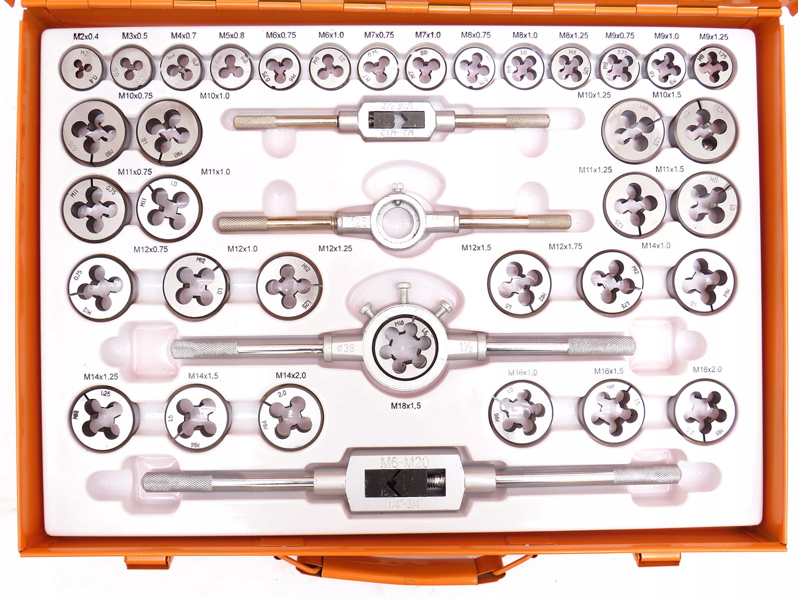 ⭐Набор метчиков и плашек упакован в удобный и удобный металлический кейс с тиснением, благодаря которому каждый элемент имеет свое постоянное место. Набор предназначен для ремонта резьбовых соединений различного калибра.