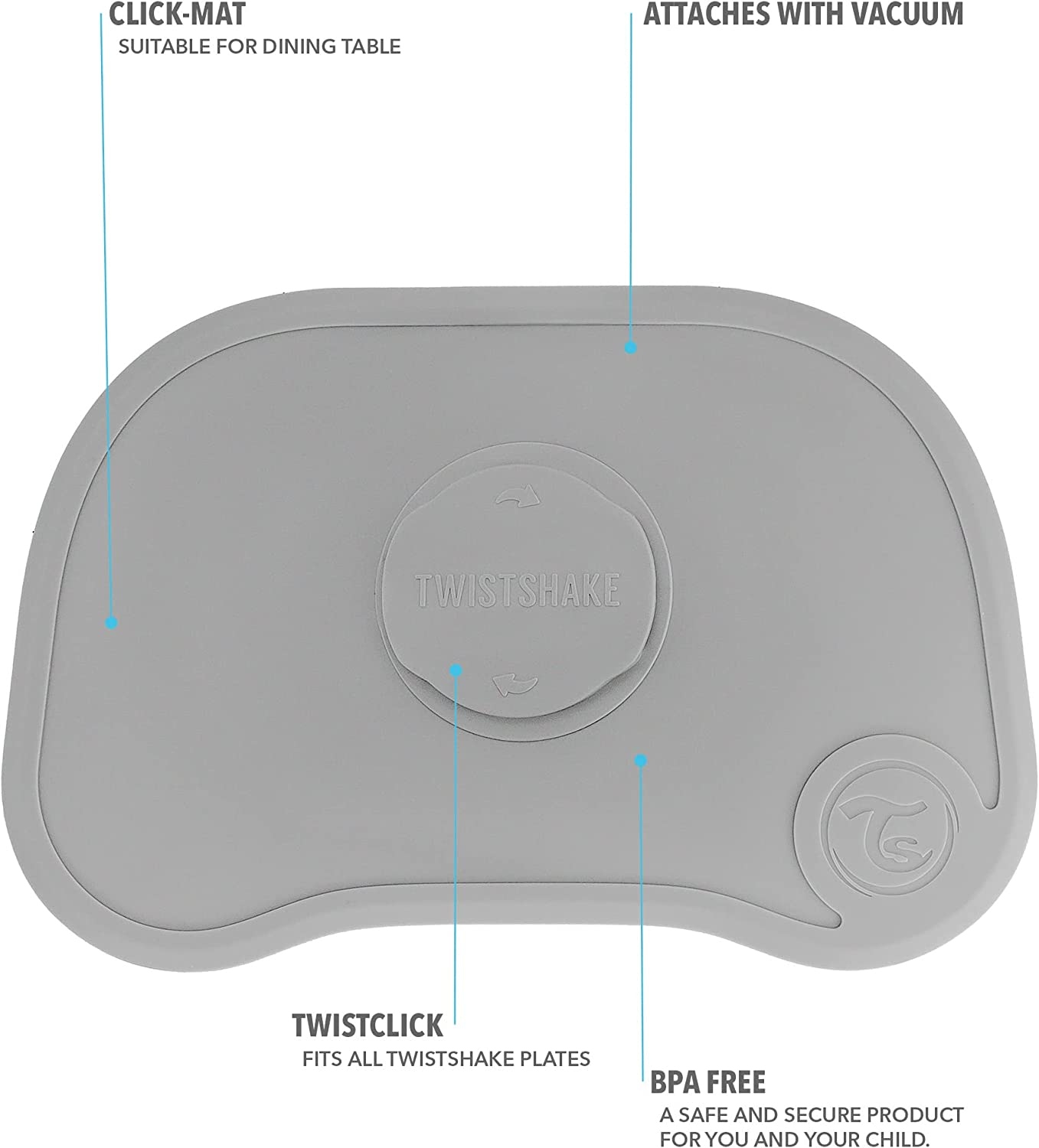 - Twistshake Click-mat MINI создан специально для детей, которые уже едят самостоятельно, сидя за столом на высоком стульчике. И ваш малыш сможет сосредоточиться на еде, а не вставать и шалить во время еды! Коврик Twistshake Click-mat изготовлен из материала высочайшего качества — мягкого силикона, что делает его прочным и простым в уходе. Он не содержит BPA, поэтому безопасен для детей и подходит для всех тарелок Twistshake: тарелок 6+ м, разделенных тарелок 6+ м и тарелок глубиной 6+ м. На верхней полке можно мыть в посудомоечной машине. Подходит для детей от 6 месяцев. • Изготовлен из материала высочайшего качества – мягкого и 100% нетоксичного силикона. • Подходит для всех моделей тарелок Twistshake – тарелки 6+ м, разделенной тарелки 6+ м и чашки 6+ м. • В комплект не входит BPA – поэтому безопасно для вас и вашего ребенка • Подходит для детей от 6 месяцев • Подходит для мытья в посудомоечной машине на верхней полке • Внимание! Не кладите Click-mat в микроволновую печь