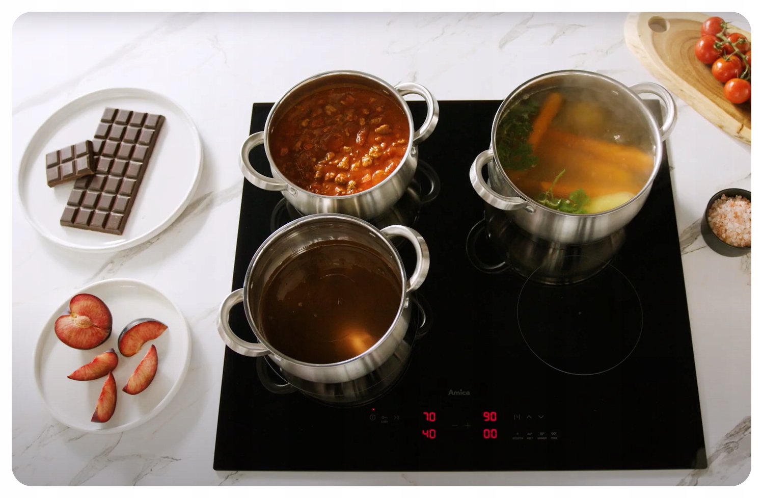 Индукционные варочные панели Amica можно подключать к одной электросети. или трехфазная электроустановка. Выберите один из пяти уровней мощности и готовьте на всех конфорках одновременно.