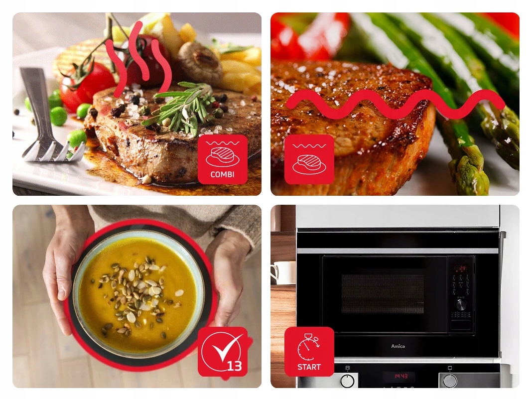 Хрустящая еда на гриле прямо из микроволновой печи? Просто так! Микроволновые печи Amica оснащены функцией Combigrill, которая сочетает в себе микроволны и функцию гриля. Благодаря этому через некоторое время ваше блюдо отлично прогреется, а сверху покроется вкусной хрустящей корочкой. Приятного аппетита!