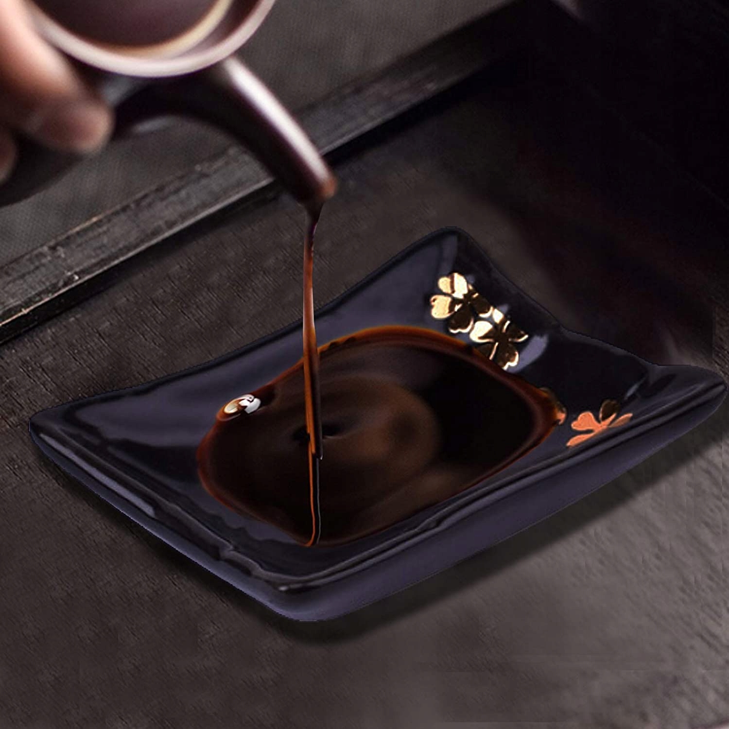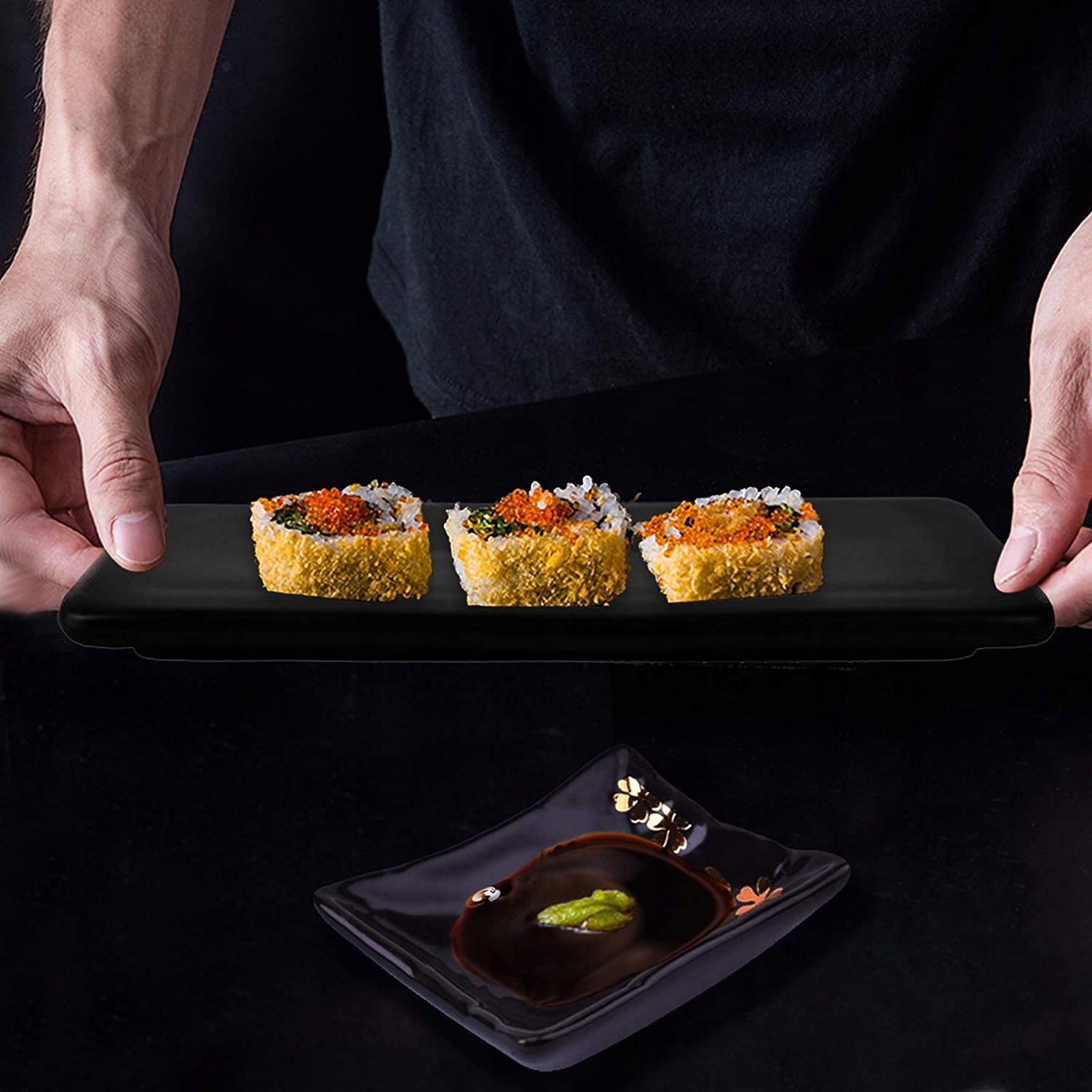 - В комплект входят: 2 тарелки для суши, 2 блюда для соуса, 2 пары палочек для еды и 2 держателя для палочек. Матовые черные керамические тарелки и блюдца имеют выраженную текстуру. Японский классический простой и элегантный стиль, подчеркивающий японскую культуру, станет отличным выбором подарка. Можно использовать в микроволновой печи и посудомоечной машине.