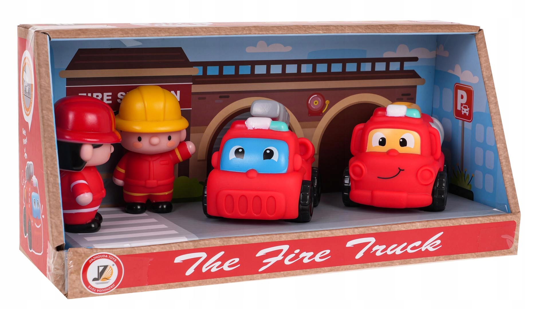красочный набор с фигурками пожарных и пожарными для детей старше 3 лет. Комплект включает в себя две фигурки пожарных и две пожарные машины. Автомобили и фигурки - резиновые, а колеса в пластиковых транспортных средствах.