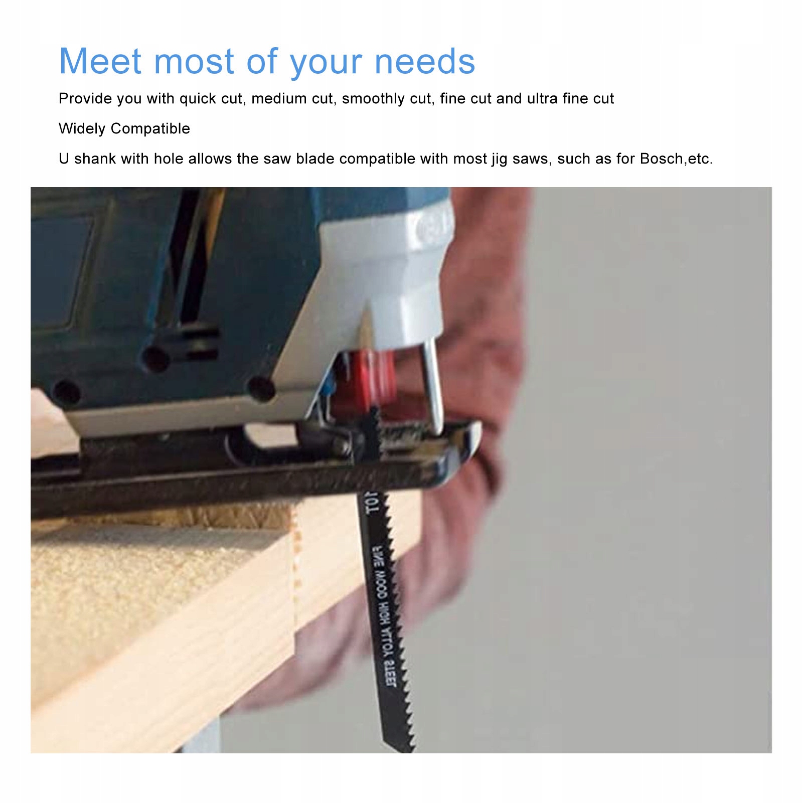 3. Широкая совместимость: U-образный хвостовик с отверстием позволяет пильному полотну быть совместимым с большинством лобзиков, таких как NaBosch и т. д.