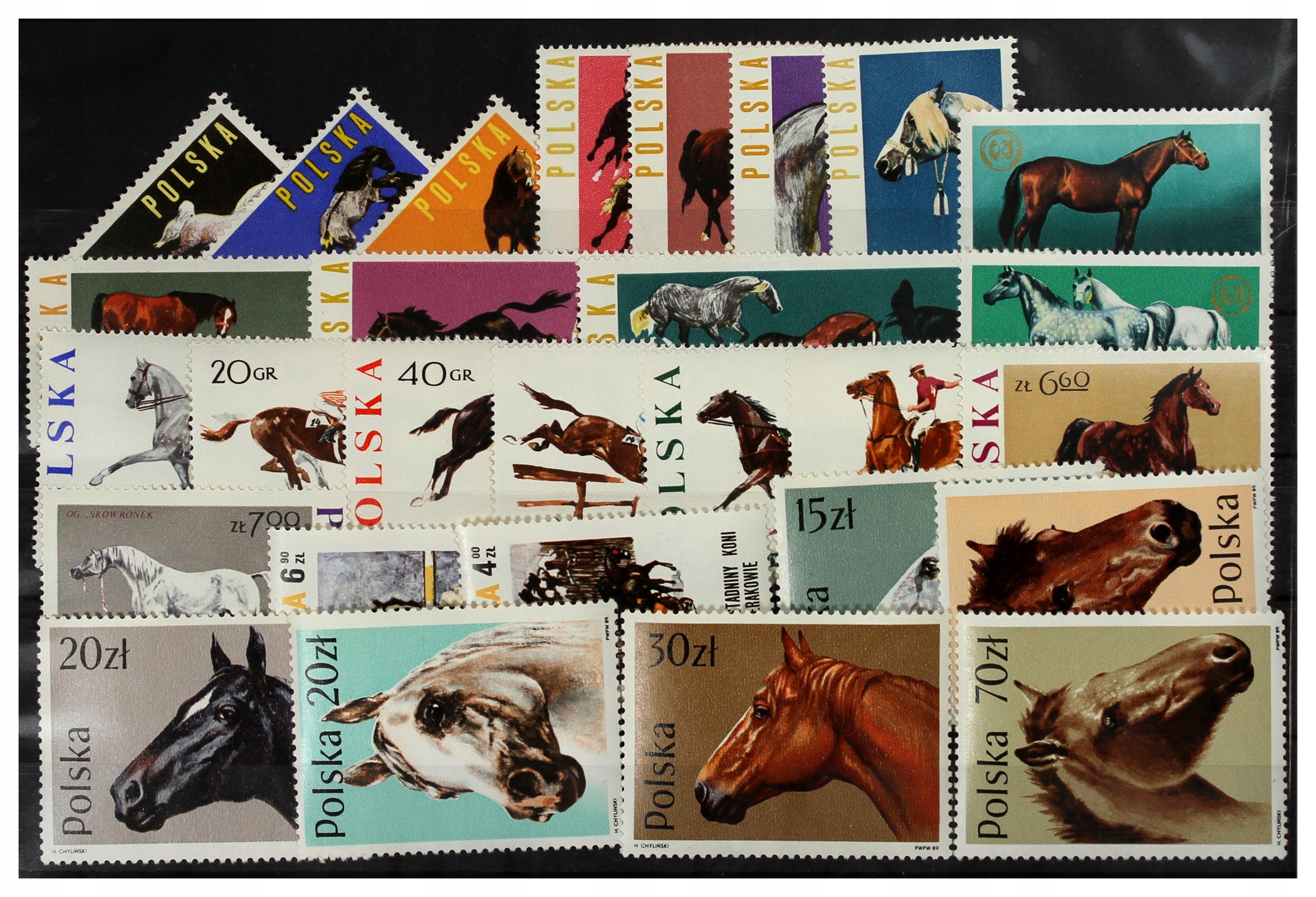 Предметом продажи являются почтовые марки с тематикой животных – лошадей, представленных на прикрепленном фото. В набор входят, среди прочего: полная серия марок о конном спорте 1967 года (фи. 1592–1599), полная серия марок с польскими лошадьми 1963 года (фи. 1299–1308) и полная серия марок с лошадьми 1989 года (фи. 3042–3047). Штампы чистые (неиспользованные), с клеем, без шарнира и/или следов шарнира.