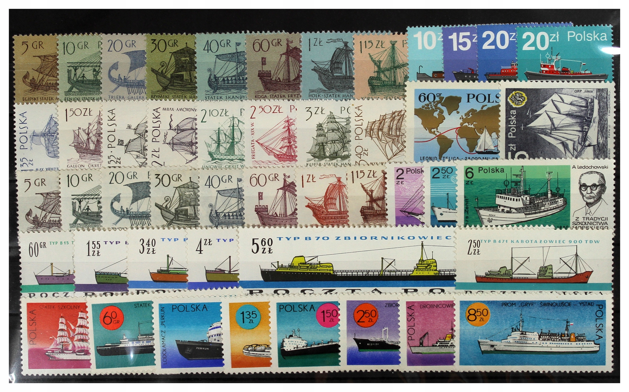 Предметом продажи являются почтовые марки с корабельной тематикой, которые можно увидеть на прикрепленной фотографии. В набор входят, среди прочего: полная серия марок Польского судостроения 1961 г. (фи. 1094–1099), полная серия марок «Парусные корабли» (I) 1963 г. (фи. 1235–1242), полная серия марок «Парусные корабли» (II) 1964 г. (фи. 1317–1324), полная серия марок «Парусные корабли». (III) 1965 г. (Фик. 1413–1420) и полную серию марок «Корабли под польским флагом» 1971 года (Фик. 1903–1910). Штампы чистые (неиспользованные), с клеем, без шарнира и/или следов шарнира.