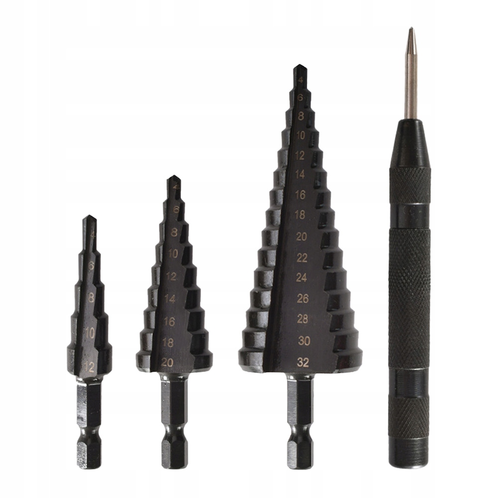 - В комплект входит: 3 шт. бита (4-12 мм/4-20 мм/4-32 мм) и 1 центральный кернер.