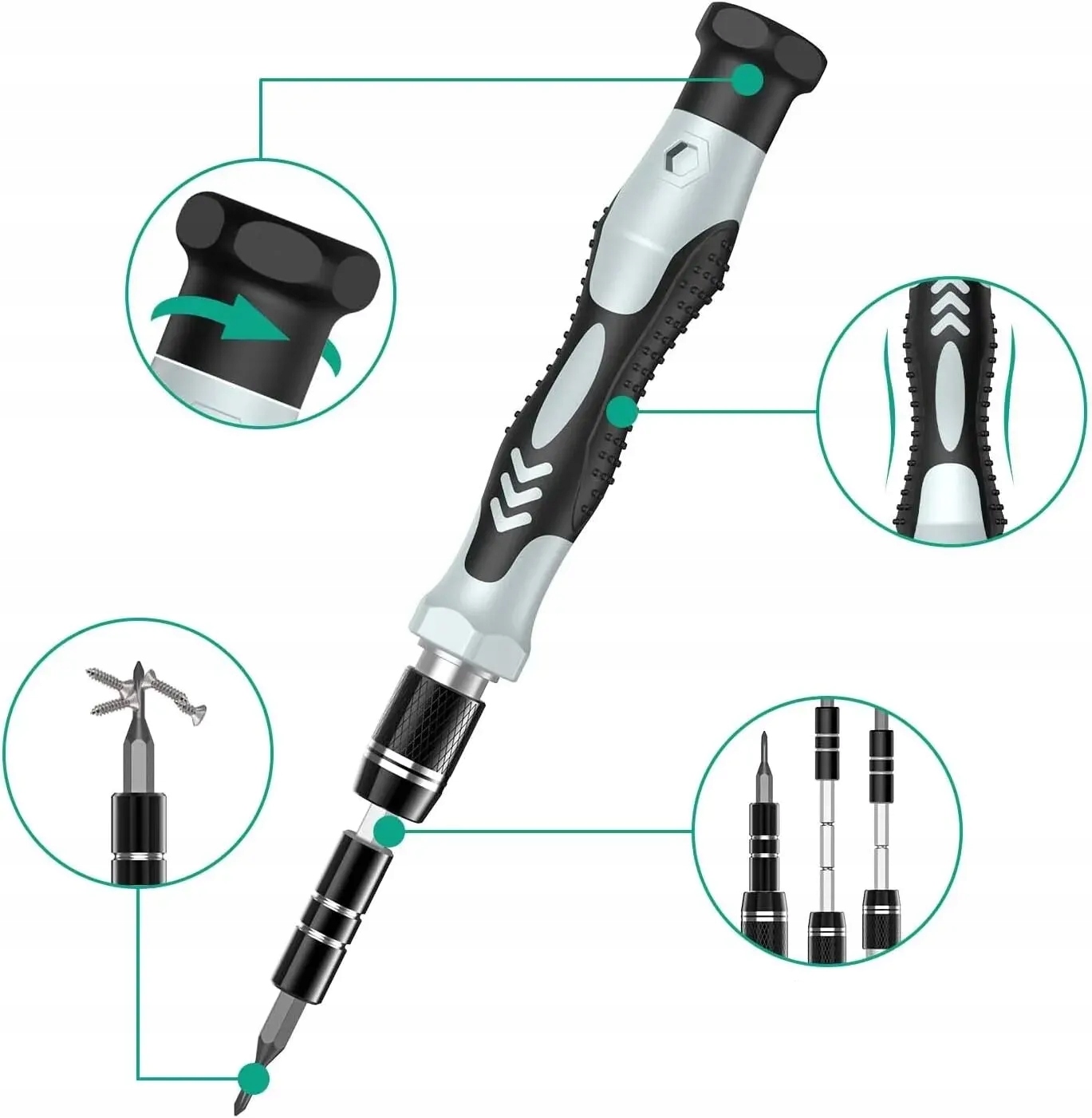 - Обширный набор прецизионных инструментов – целых 132 элемента, в том числе 108 отверток, в том числе: Torx и многие другие инструменты для профессионального ремонта. Коллекция отверток упакована в удобный футляр для удобного хранения и транспортировки. Сменные биты различных размеров и форм, которые можно установить на универсальный держатель, сэкономят место как в мастерской, так и в вашем ящике для инструментов.