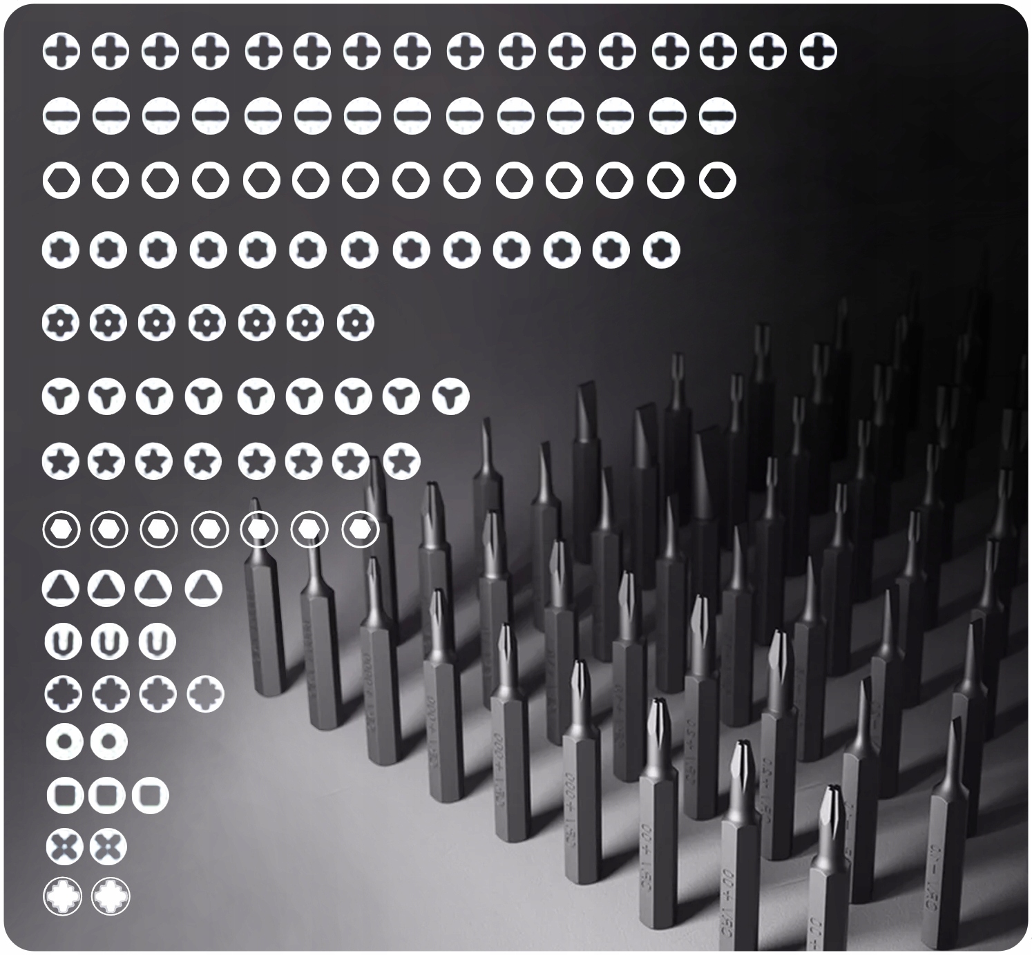 Phillips, с прорезями, Torx, трехкрылый, пятилепестковый, треугольный, шестигранный, гнездо, U-образный, крестообразный треугольник, выталкиватель SIM-карты, квадратный, с выступом