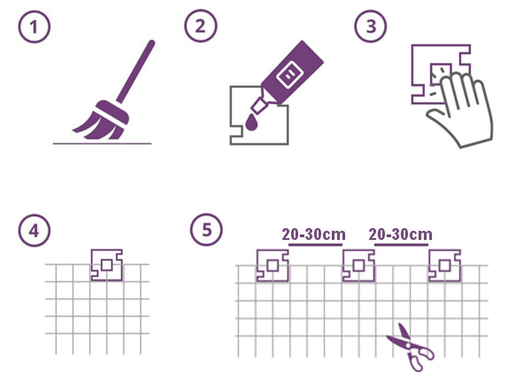 <р>1. Тщательно очистите места установки крючков. <р>2. Прикрепляйте крючки только на сухую поверхность. Сначала нанесите клей на крючок. <р>3. Затем поместите крючок на поверхность и нажмите, чтобы клей распределился равномерно. Расстояния между крючками должны быть не менее: 20 см – защита от кошек или 30 см – защита от птиц. <р>4. После высыхания клея (около 24 часов) приступайте к прикреплению сетки. <р>5. Отрежьте лишнюю сетку ножницами.ПРЕИМУЩЕСТВА КРЕПЛЕНИЯ НА КРЮКИ