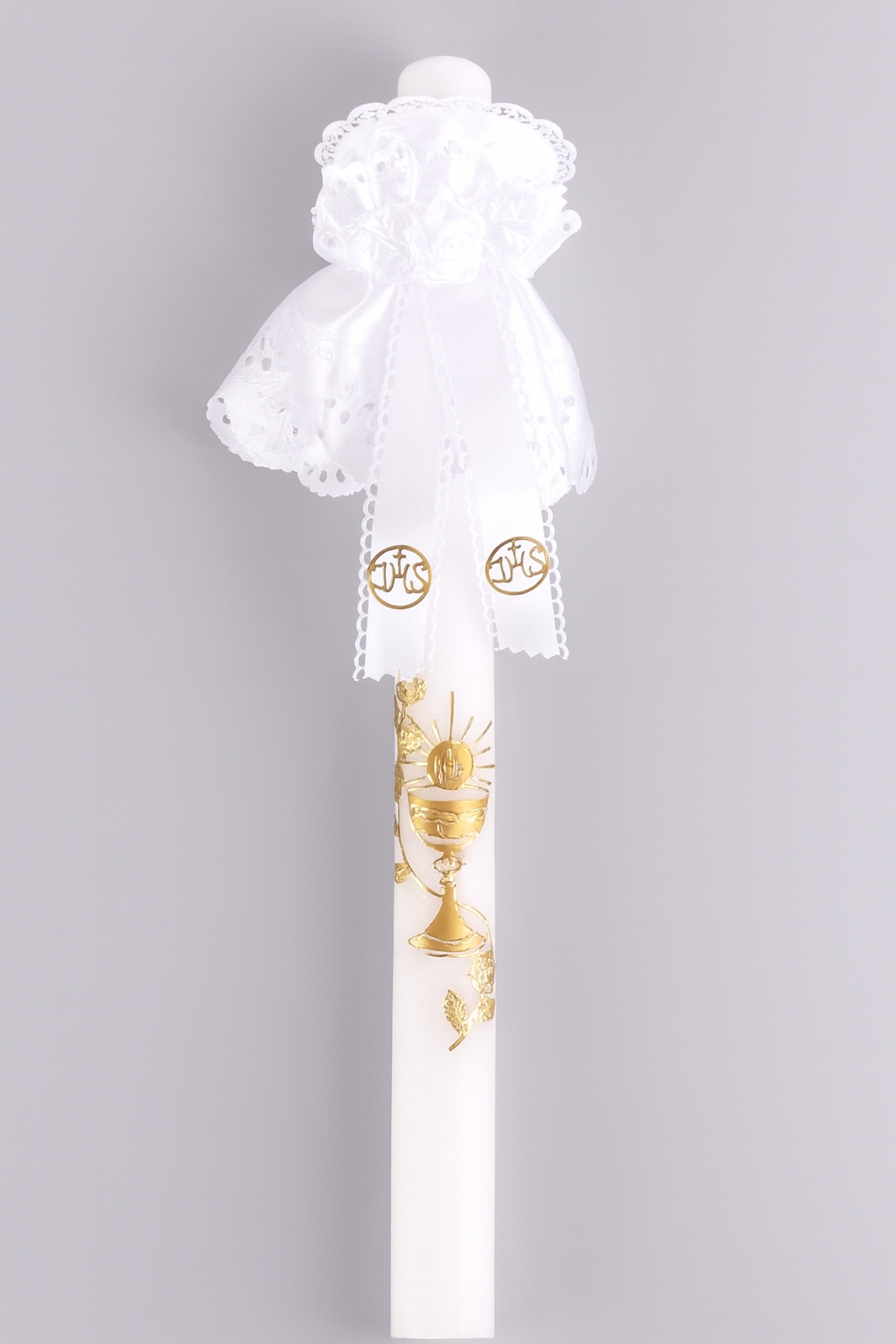 Изящная свеча для причастия, идеальная для Первого причастия, украшенная золотым мотивом чаши с хозяином и виноградом - символом Евхаристии.