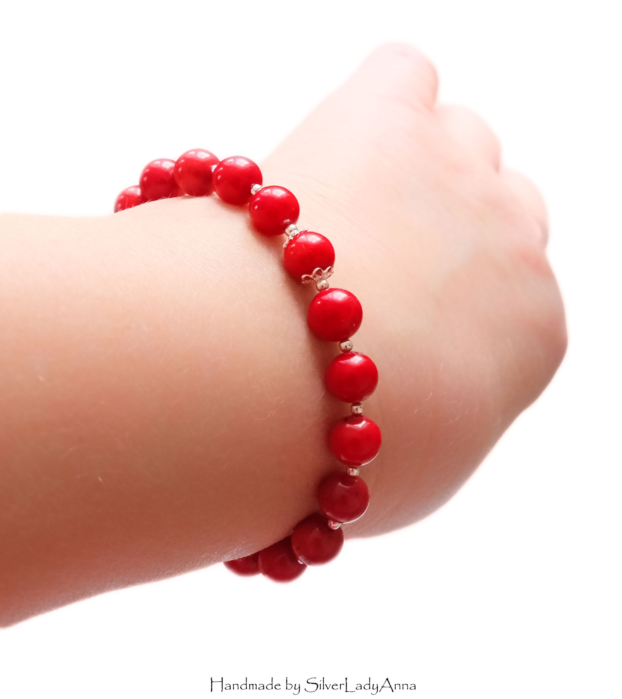 Элегантный комплект украшений, браслет и серьги из красивых красных кораллов и серебра. Браслет на резинке, закрытые английские ушки.